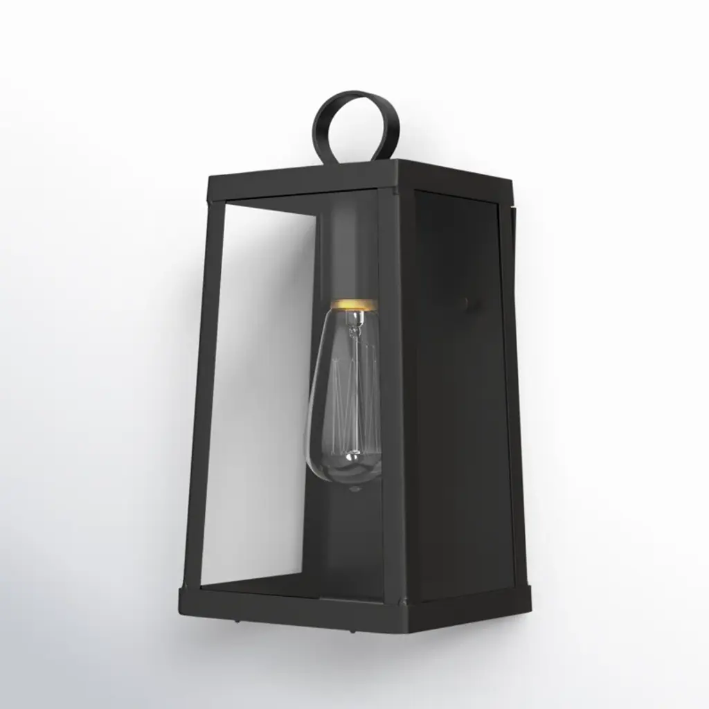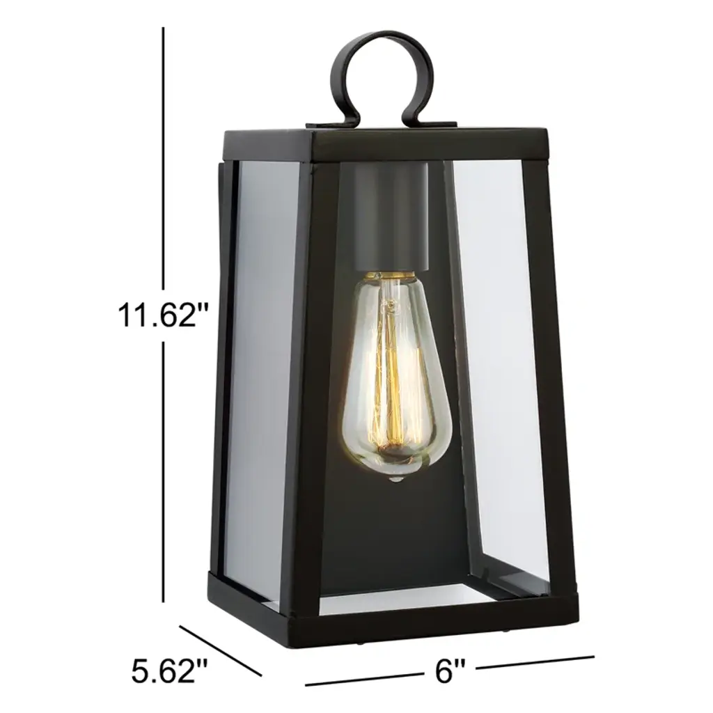 The Middlebury one light outdoor wall fixture in black creates a warm and inviting welcome presentation for your home's exterior. Showcase a classic look with rugged flair in the Middlebury Collection. Utilizing a modern and sharply squared off lantern shape to frame a single bulb, these fixtures give a new look to a familiar shape. Through the clear glass exterior, light shines with brightness and longevity. With a vintage-style bulb inside of a clear glass, it's sure to enhance the nostalgic touch you're looking for. The simple textured Blacksmith finish of the Middlebury is designed to enhance you home's curb-appeal. Available in a variety of sizes for flexible options to match and complement a wide variety of exterior settings.