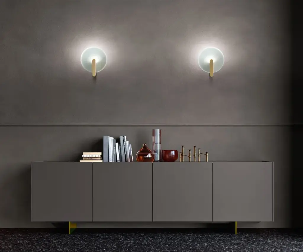 Sinua is a wall lamp with sculptural and sinuous lines designed by Steven Haulenbeek for Italamp. An evanescent light disk, reminiscent of the magic and poetry of a moon eclipse, born from the apparent contrast between matter and transparency. The important thickness of the cast glass crystal diffuser, in fact, is crossed by the LED light source that spread on the body of glass, diffuses a luminous aura of great charm. The lamp is supported by a metal structure, available in 3 finishes: light gold, chrome and white.Sinua interprets the perfect combination of industrial design and art: no longer just a functional object, but an artistic expression that comes from the harmony of contrasts and becomes the protagonist of the environment thanks to its strong personality. Electrical and technical characteristicsLED: 9 wLumen: 1100Temperature: 3000 KCRI>80Driver: TRIAC (included - dimmable on request), available with Casambi bluetoothVoltage: 230 VEnergy class: A++IP20Certifications: CE/EAC/DAD
