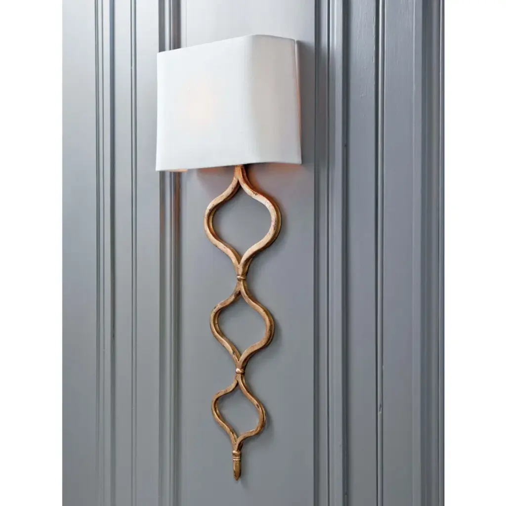 With a rich finish, the elegant twisting pattern of the sinuous metal sconce creates a stylish statement. Topped by a contemporary natural linen shade, completes the classic look.