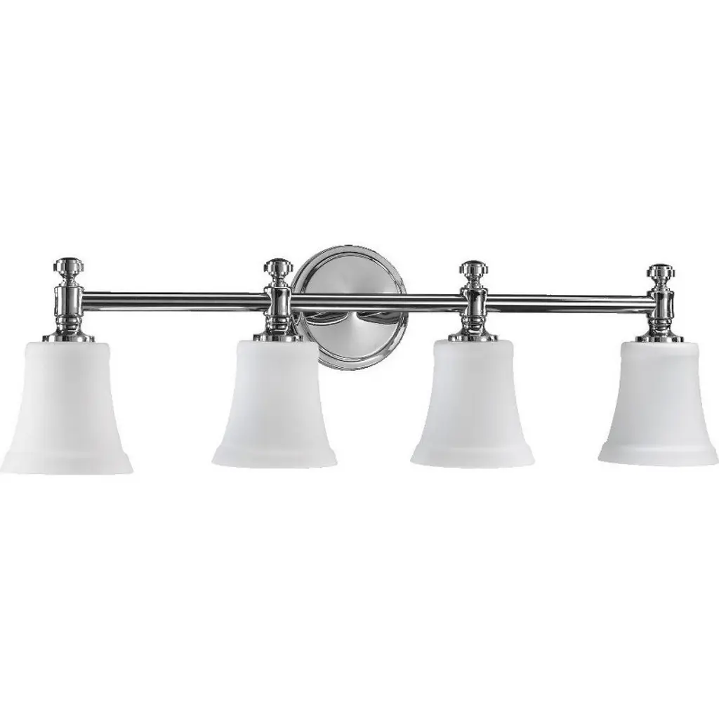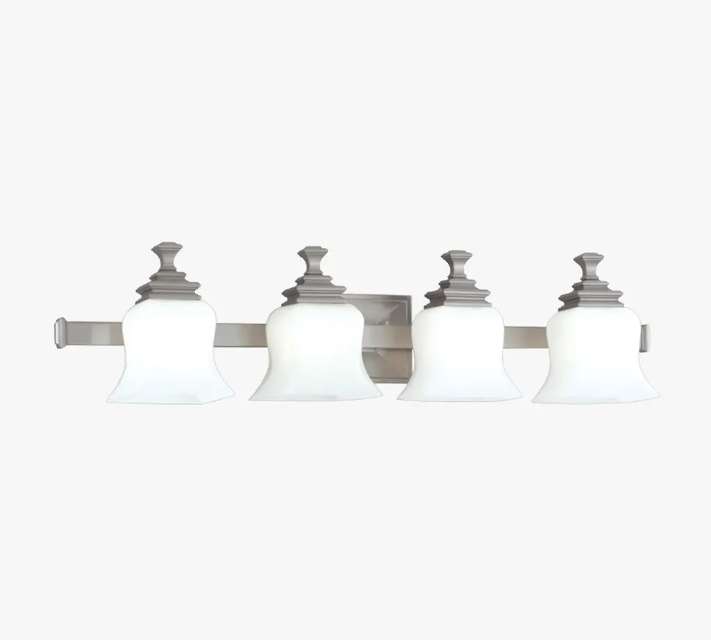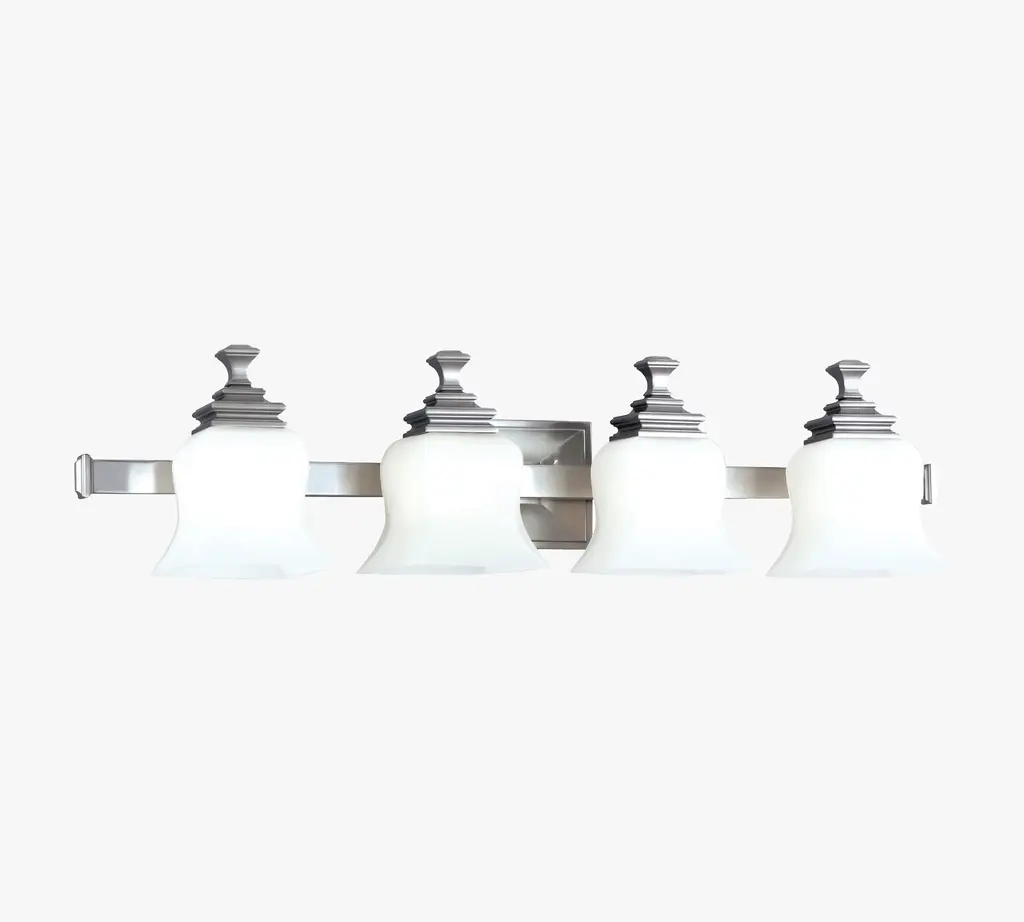 An intricate tension of opposites comes together in this quadruple sconce. Cast linear steps, linked by subtle curves, create the square metal socket holder, artfully contrasted by the bell contour of opal glass. With its far-reaching glow, this distinctive piece adds a sensual and elegant touch to your bathroom.