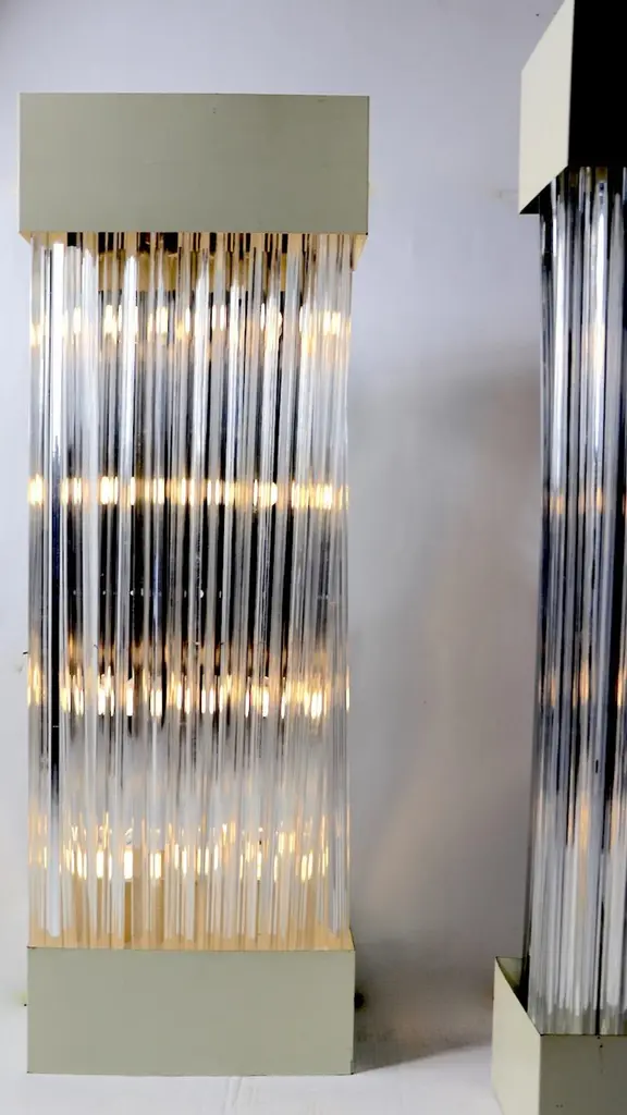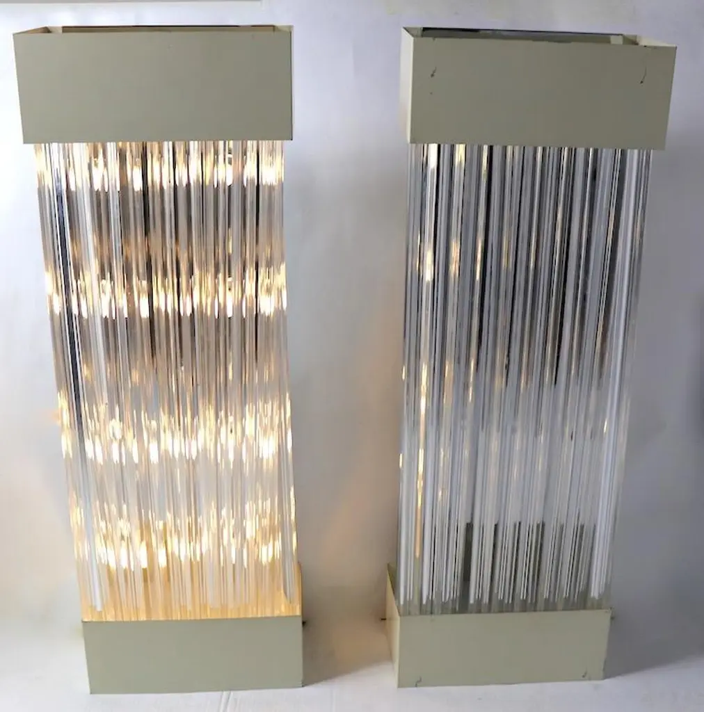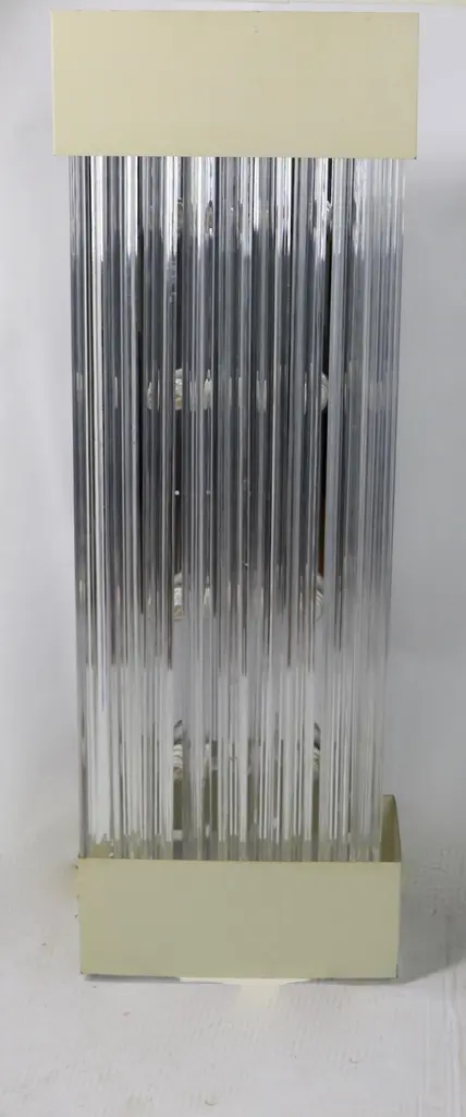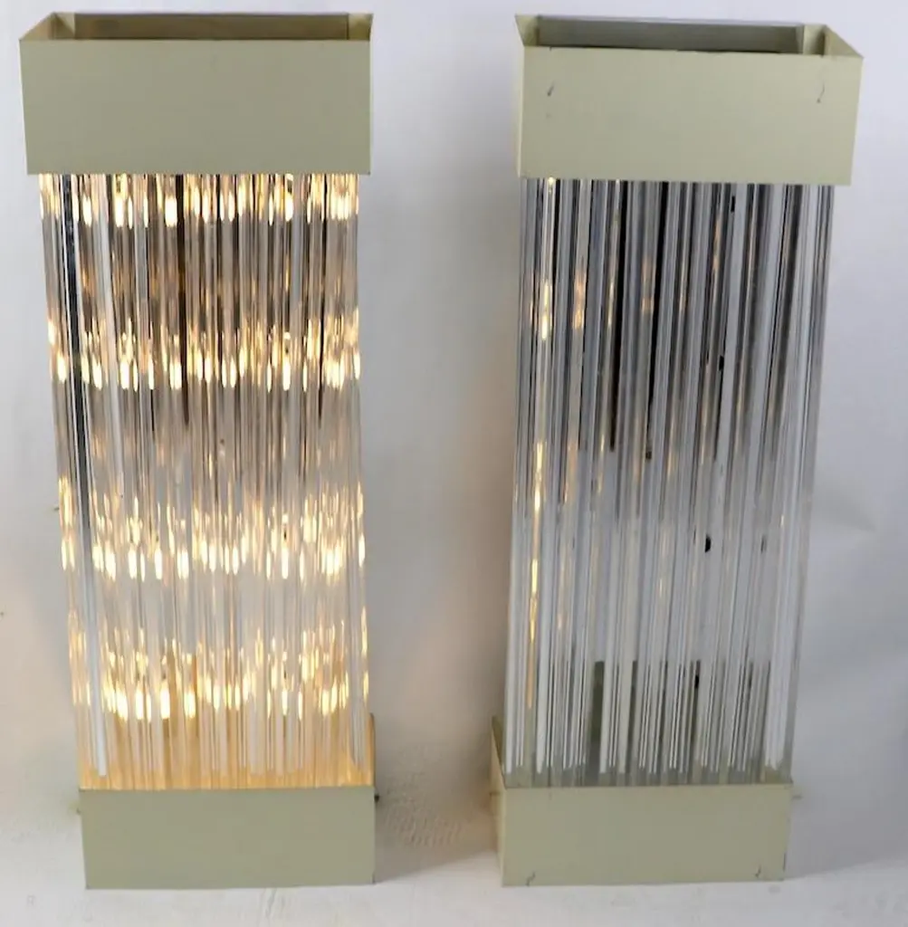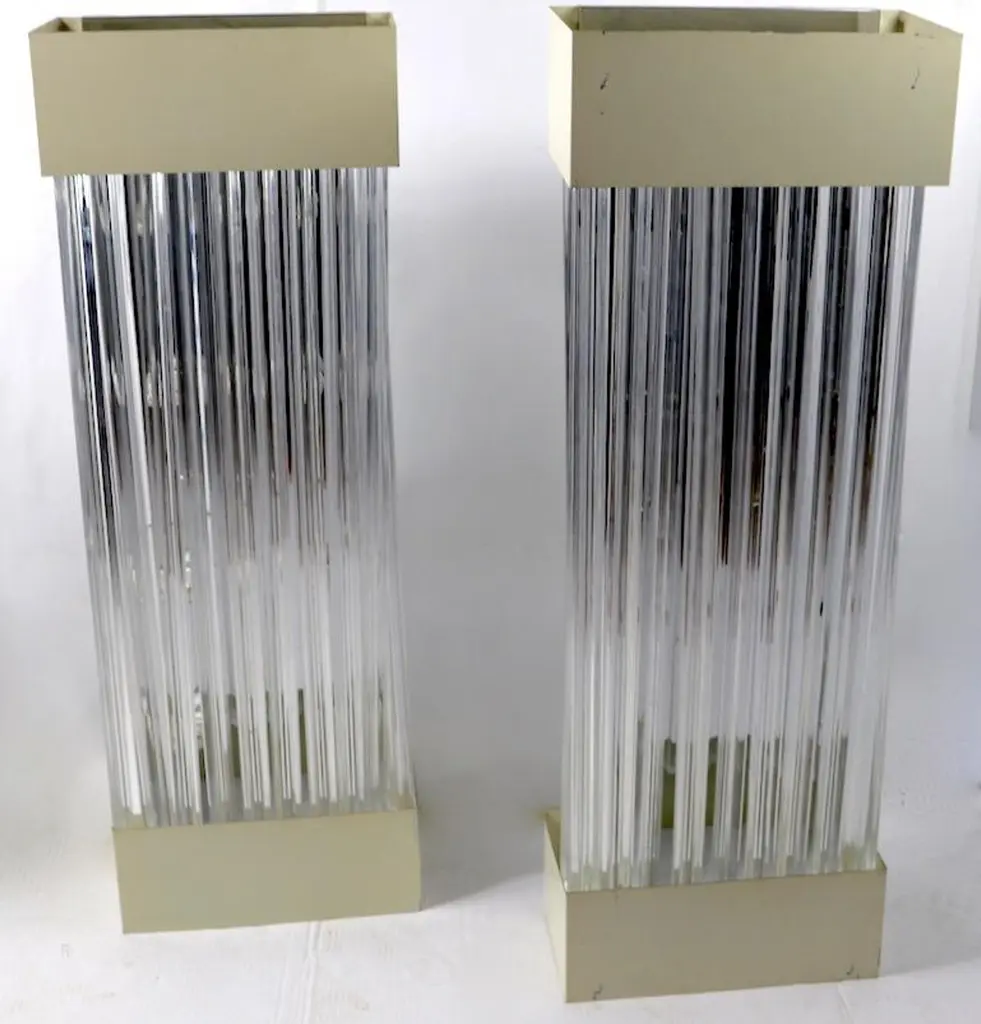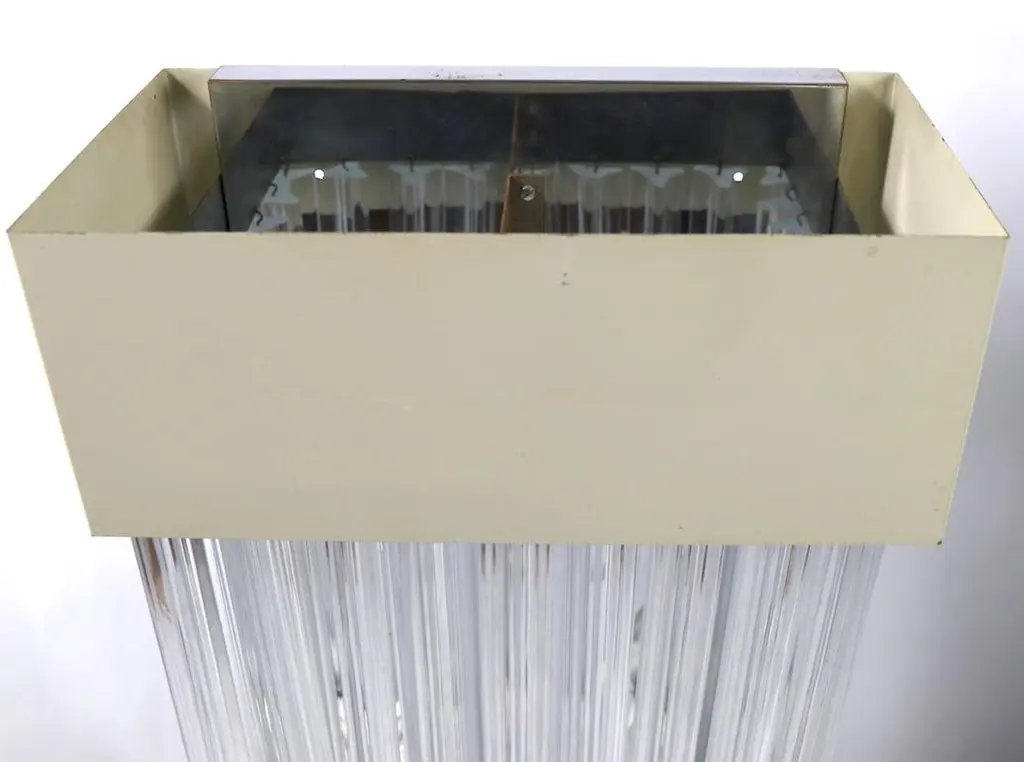 Incredible set of 6 large sconces having cream colored tops and bottoms, with a series of triangular prisms which hang in the body of the sconce as diffusers. Each sconce has a chrome back plate, with eight sockets which accept standard size screw in bulbs. Cream colored elements each 6 inch H - some show slight cosmetic wear to paint finish. Originally from Kutsher's, an iconic Catskill area resort All are complete, working and ready to install. Offered and priced individually, but we would love to see them stay together.