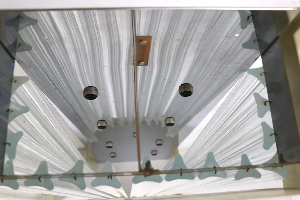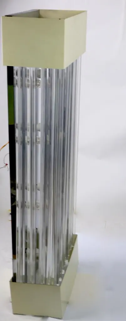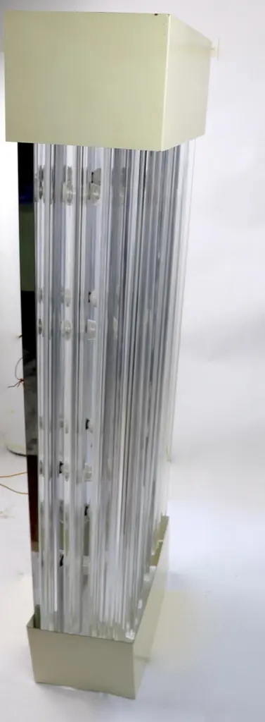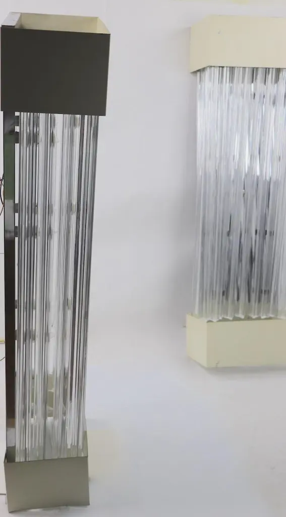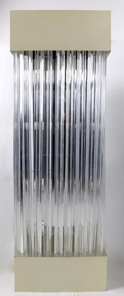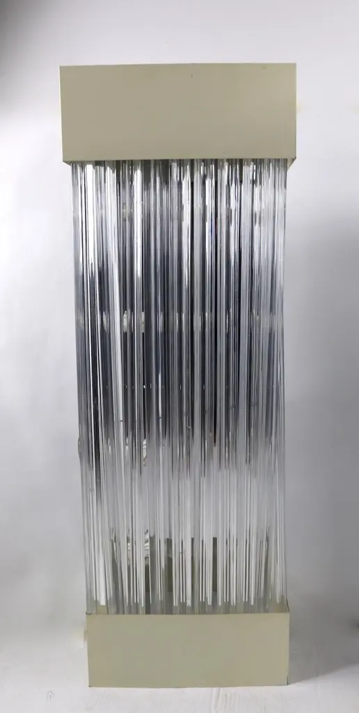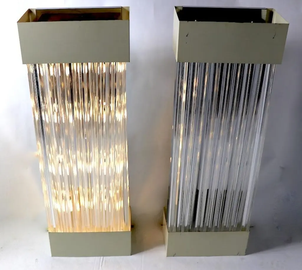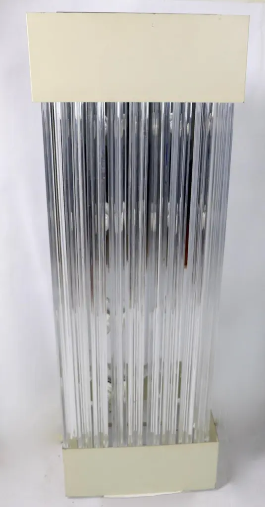 Incredible set of 6 large sconces having cream colored tops and bottoms, with a series of triangular prisms which hang in the body of the sconce as diffusers. Each sconce has a chrome back plate, with eight sockets which accept standard size screw in bulbs. Cream colored elements each 6 inch H - some show slight cosmetic wear to paint finish. Originally from Kutsher's, an iconic Catskill area resort All are complete, working and ready to install. Offered and priced individually, but we would love to see them stay together.