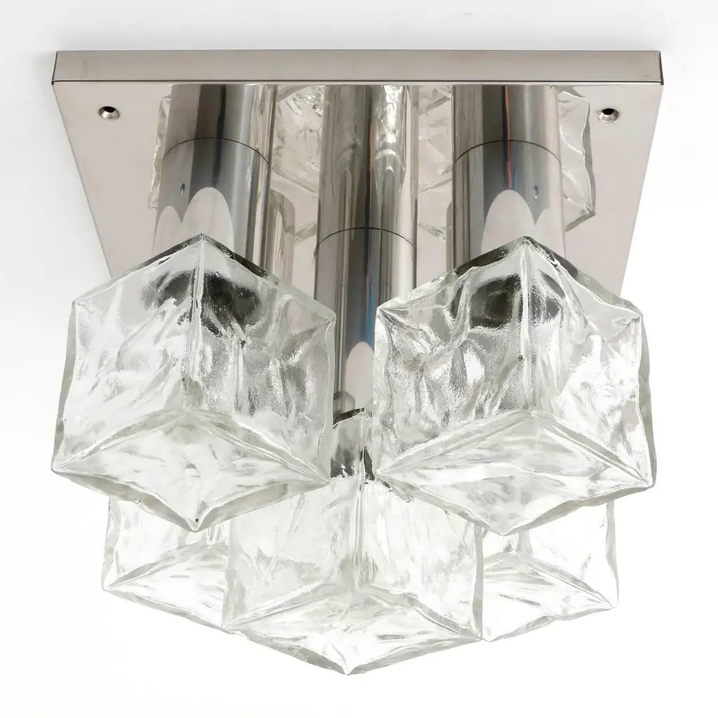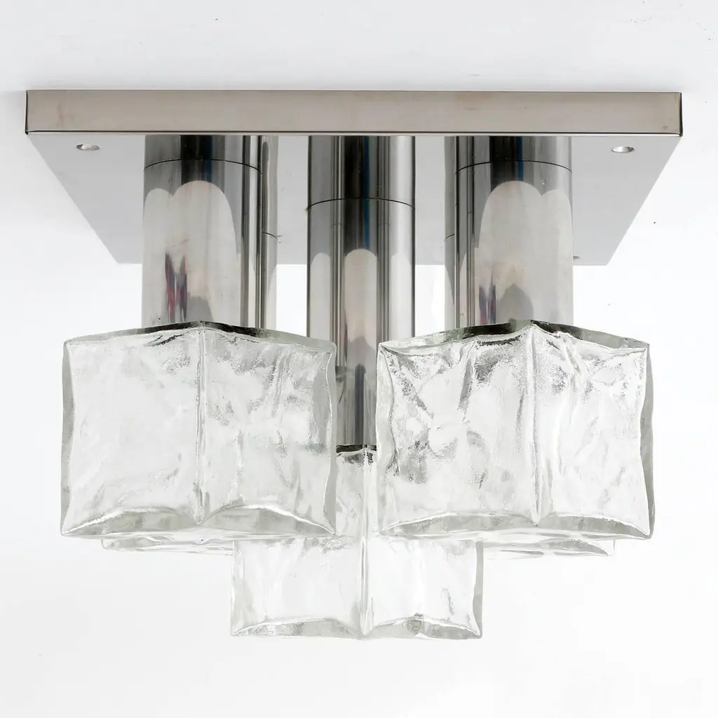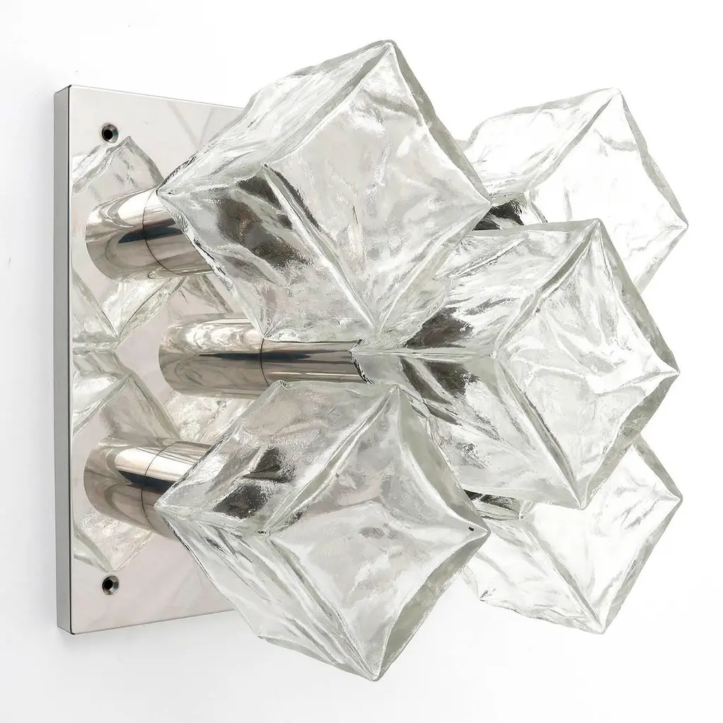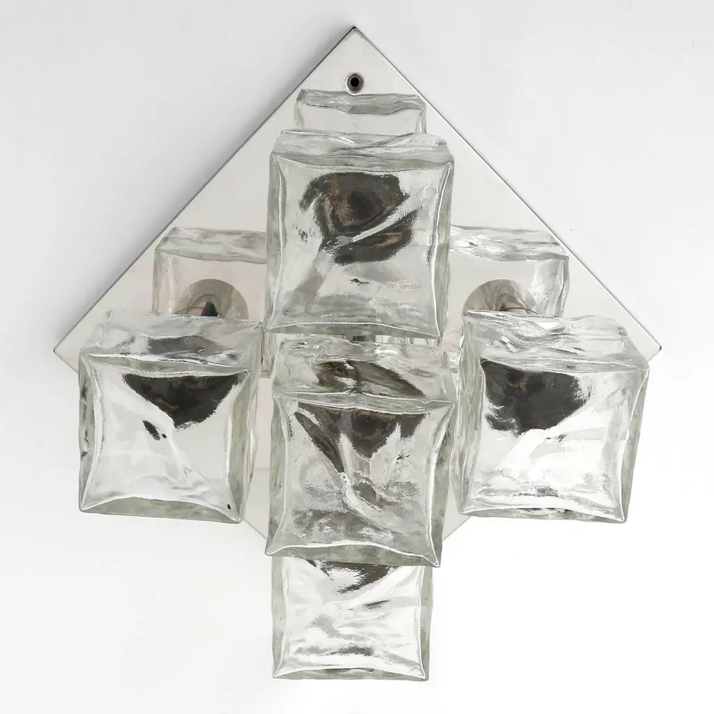 One of six modulare and square light fixtures model 'Cubus' (German 'Würfel') by Kalmar, Austria, manufactured in midcentury, circa 1970 (late 1960s or early 1970s).They are made of polished stainless chromium steel and frosted cubic glasses. Each fixture takes five small screw base bulbs up to 40w per bulb which are covered with textured ice glass cubes. Professionally cleaned, ready to use. They can be used as wall or flush mount lights.They also can be grouped and arranged individually to larger light sculptures (see last image of a brass version of the lights).The price is per lamp. They will be sold singly, as pair, or as set of three, four, five or six. Shipping cost depends on number ordered items.
