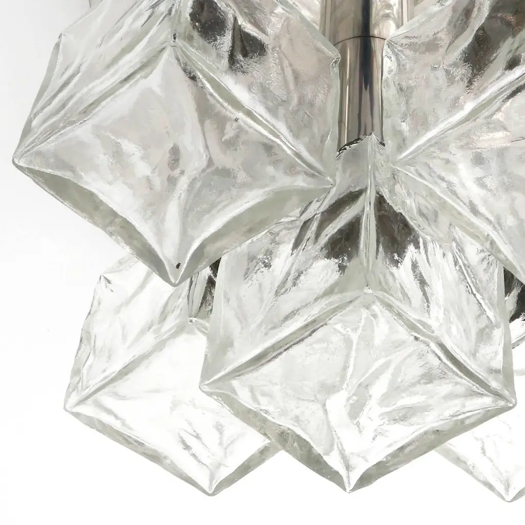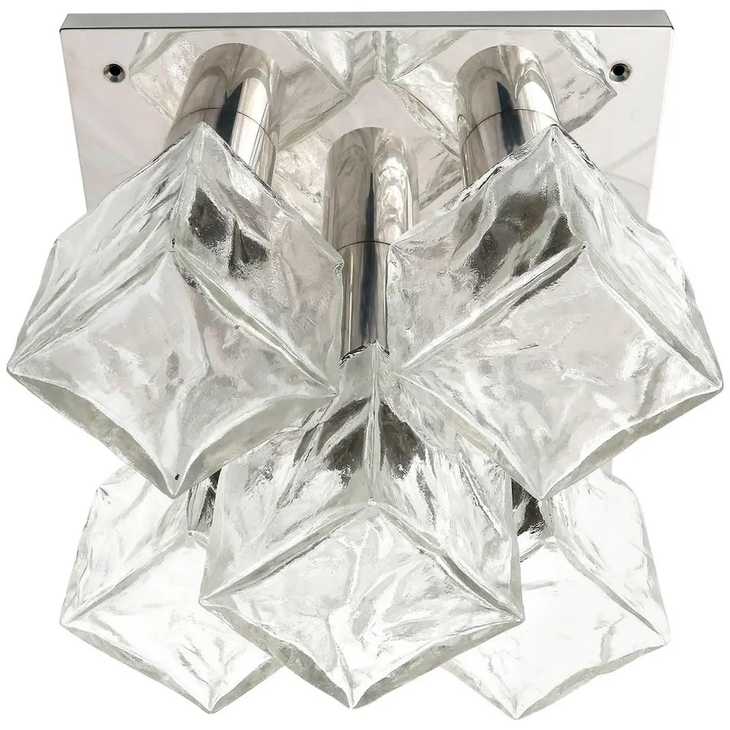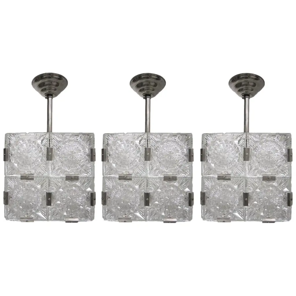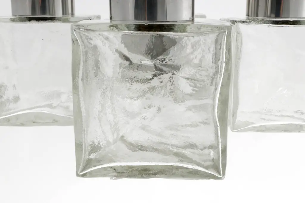 One of six modulare and square light fixtures model 'Cubus' (German 'Würfel') by Kalmar, Austria, manufactured in midcentury, circa 1970 (late 1960s or early 1970s).They are made of polished stainless chromium steel and frosted cubic glasses. Each fixture takes five small screw base bulbs up to 40w per bulb which are covered with textured ice glass cubes. Professionally cleaned, ready to use. They can be used as wall or flush mount lights.They also can be grouped and arranged individually to larger light sculptures (see last image of a brass version of the lights).The price is per lamp. They will be sold singly, as pair, or as set of three, four, five or six. Shipping cost depends on number ordered items.