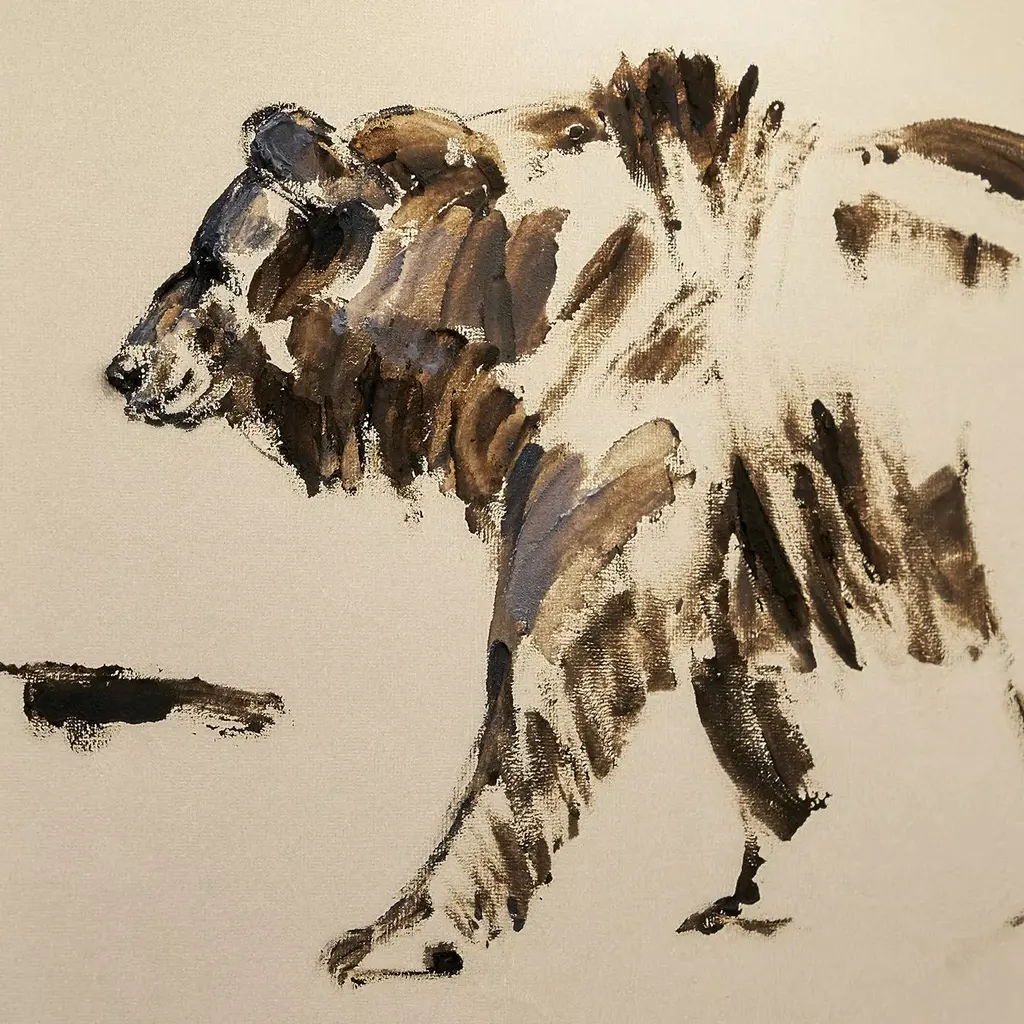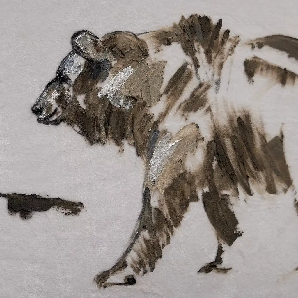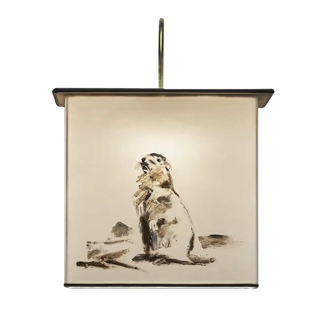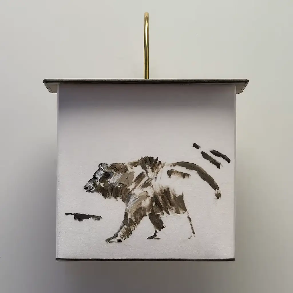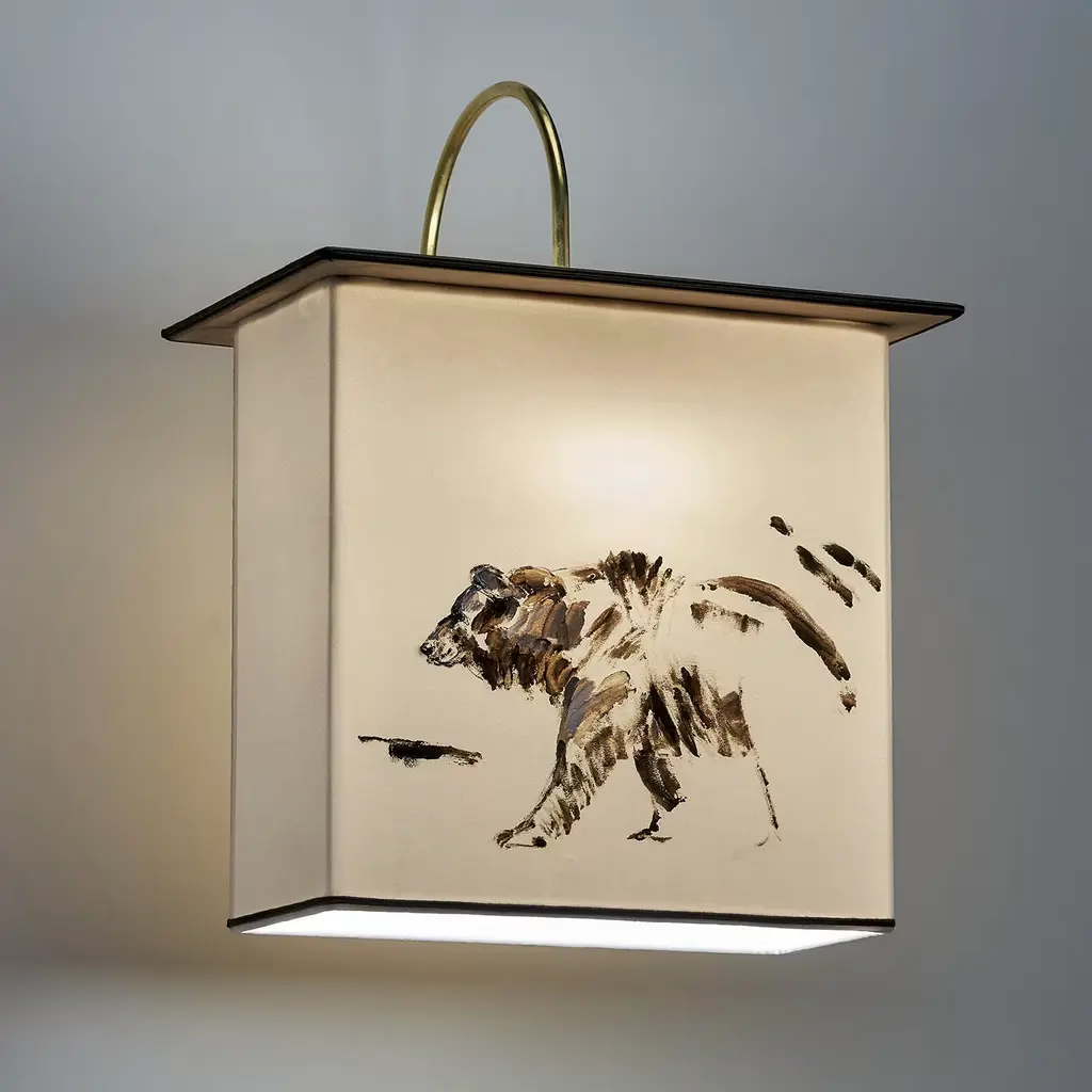 This refined sconce of the High Altitude Collection is composed of a brass structure supporting the lampshade in lightweight taupe Oyster velvet with mink borders. Mounted on a brass structure composed of a small round wall plate (⌀ 12 x H 2 cm) with a rectangular top (40 x 25 cm) suspended from a slender, curved rod, this sconce boasts a splendid hand-painted decoration of a bear sketch on the front, the delicate mink gradients creating a three-dimensional effect when the illumination is on. Contact the Concierge for customization available of shape (oval or square) and fabric (linen).