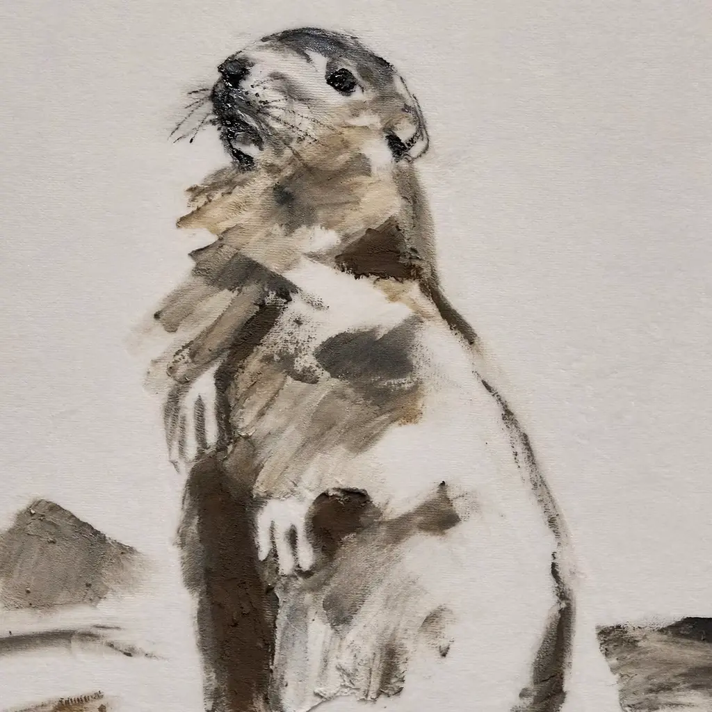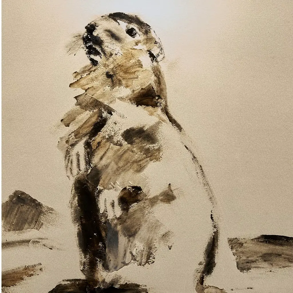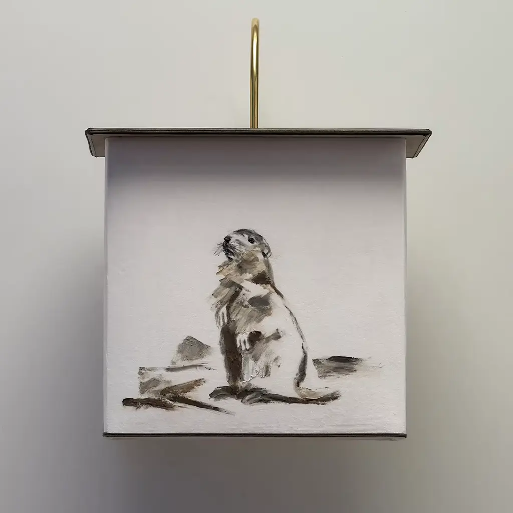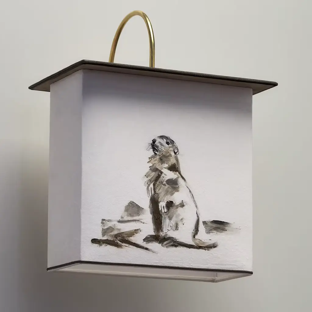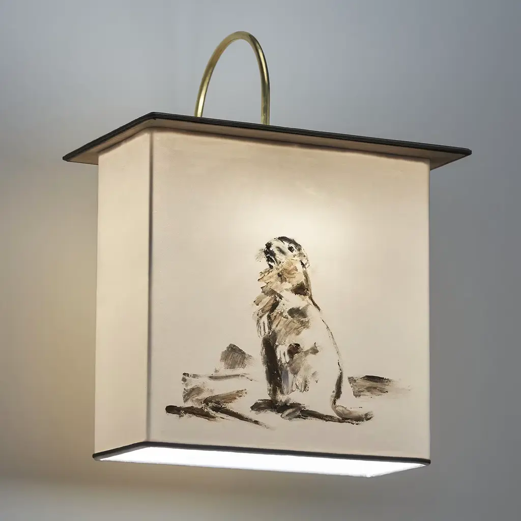 A sophisticated addition to any room, especially when paired with the other pieces of the same High Altitude Collection, this refined sconce combines natural brass and soft Oyster velvet in a simple silhouette. Extending from a round wall plate (⌀ 12 x H 2 cm) with a slender, curved arm, the rectangular shade mounted on a brass top (40 x 24 cm) boasts a delicate hand-painted sketch of a marmot emerging from a taupe background. It is possible to request customization for the shape (square or oval) and fabric (linen) to match any interior decor need. Contact the Concierge for details.