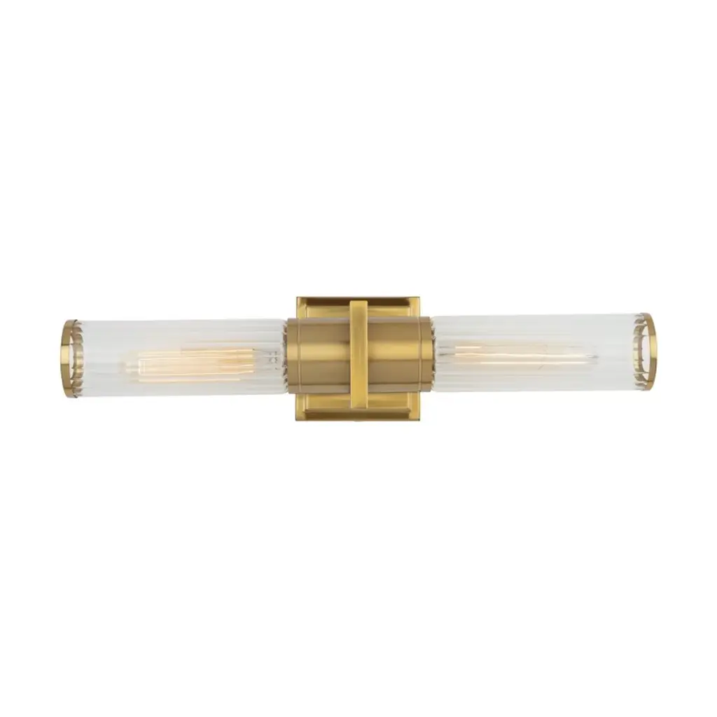 Lead the way with the wide-sweeping glow and dashing line accents of the Slade Double Light Wall Sconce from Alder & Ore. The modern or contemporary space makes the best use of this piece’s geometric shapes. Its square backplate rests on the wall with a small footprint. It shares a bold finish with the cylindrical holder in front. This holder extends a pair of lamps and gorgeous ribbed glass shades. These shades disperse a sweeping cast of light as they catch warm, intricate highlights.