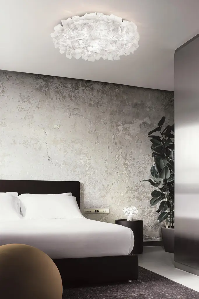Handcrafted from interlocking Cristalflex® petals, complete with a magnetic system that allows for easy installation and cleaning, Clizia Pixel ceiling (or wall sconce) is covered in a white, tech-inspired pattern. A white dusting inside the decorative elements helps evenly distribute the light without glare. Available in three sizes, as well as suspension and applique.Size: Ø 32 cm x 15 cm / 12-1/2” x 5-3/4”Colors: PixelMaterials: CristalflexWith: Magnetic SystemLight source: Bulbs E14: 2 x 6W LED filament.