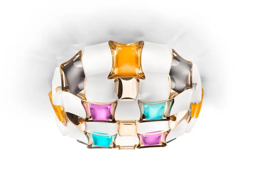 Mida is a ceiling/wall lamp with our exclusive magnetic system, inspired by the world of haute couture jewels. A pavè of precious gems encrust an almost invisible setting, and polishedcabochon are geometrically scattered across a floral corolla with silky, iridescent stones. Available in five color combinations, from the flashy multi-color, to the more versatile white/platinum and white/gold. Mida is fully handcrafted of white Opalflex and printed Lentiflex, whose silky morphing effect alternates with the brushed metallized “gems”. Mida makes any room extra-luxurious.Size: Ø 50 cm x H 16 cm / Ø 19” x H 6-1/4”Available colors: Multi-color, amber, rose, white/platinum, white/goldAvailable materials: Lentiflex / Opalflex / Goldflex / Steelflex / CopperflexWith: Magnetic SystemLight source: Bulbs E27: 3 x 12W LED filament