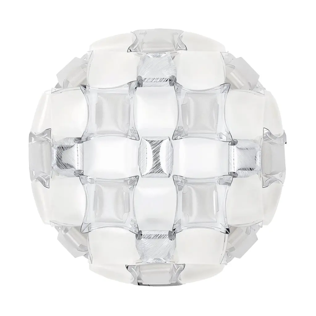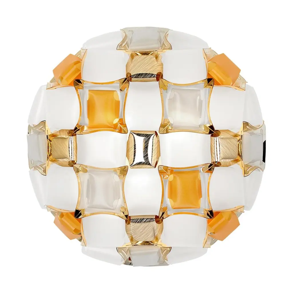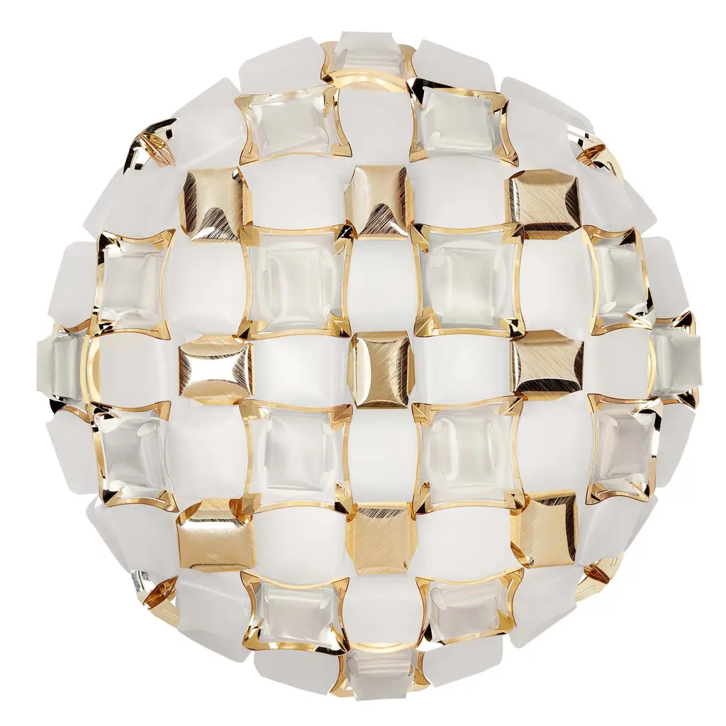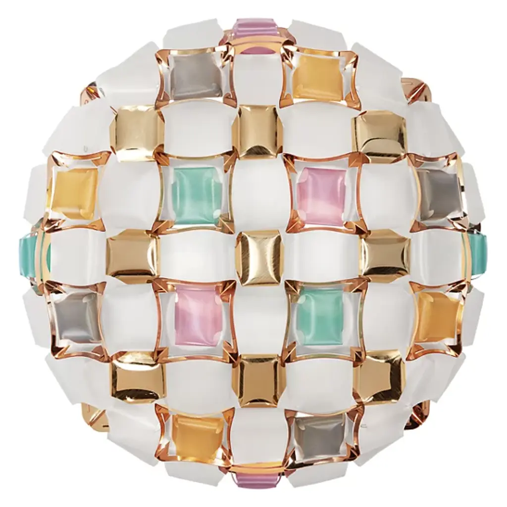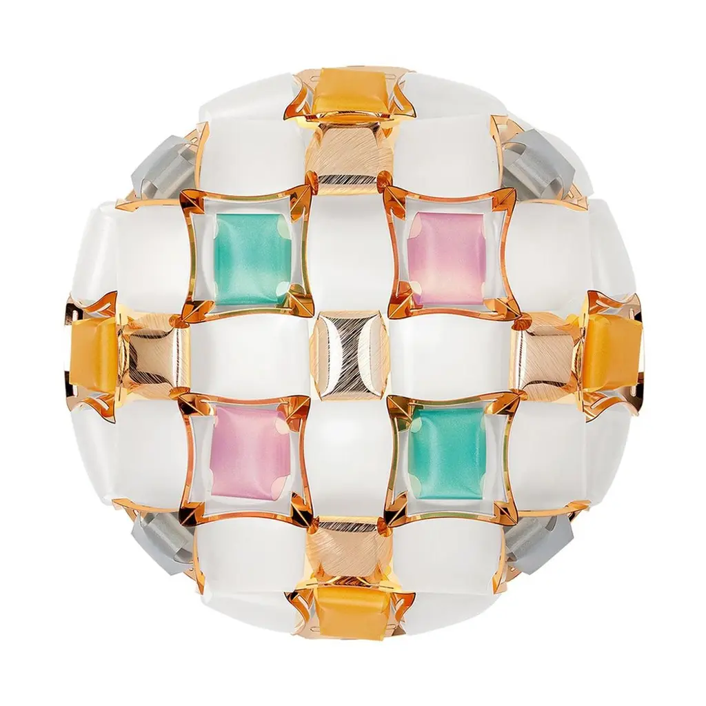 Mida is a ceiling/wall lamp with our exclusive magnetic system, inspired by the world of haute couture jewels. A pavè of precious gems encrust an almost invisible setting, and polishedcabochon are geometrically scattered across a floral corolla with silky, iridescent stones. Available in five color combinations, from the flashy multi-color, to the more versatile white/platinum and white/gold. Mida is fully handcrafted of white Opalflex and printed Lentiflex, whose silky morphing effect alternates with the brushed metallized “gems”. Mida makes any room extra-luxurious.Size: Ø 50 cm x H. 16 cm / Ø 19” x H. 6-1/4”Available colors: Multi-color, amber, rose, white/platinum, white/goldAvailable materials: Lentiflex / Opalflex / Goldflex / Steelflex / CopperflexWith: Magnetic SystemLight source: Bulbs E27: 3 x 12W LED Filament.