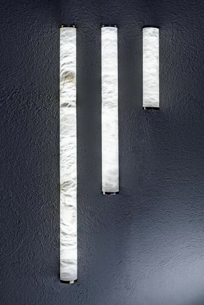 Slim ws 96 wall lamp by united alabaster dimensions: d 6 x h 96 cm materials: alabaster, copper (black nickel finish) also available: satin gold and nickel finishes all our lamps can be wired according to each country. If sold to the usa it will be wired for the usa for instance. Minimalist wall light, giving a subtle touch to any style of decoration with the possibility of applying several, creating a rhythm in each point of light. Slim ws is characterized by being a wall or ceiling fixture that will give any space a sophisticated, contemporary and unique lighting that has different configuration possibilities, being able to choose the finish of the structure between the black nickel, satin gold or nickel finishes. up to 250v (europe/uk standard).