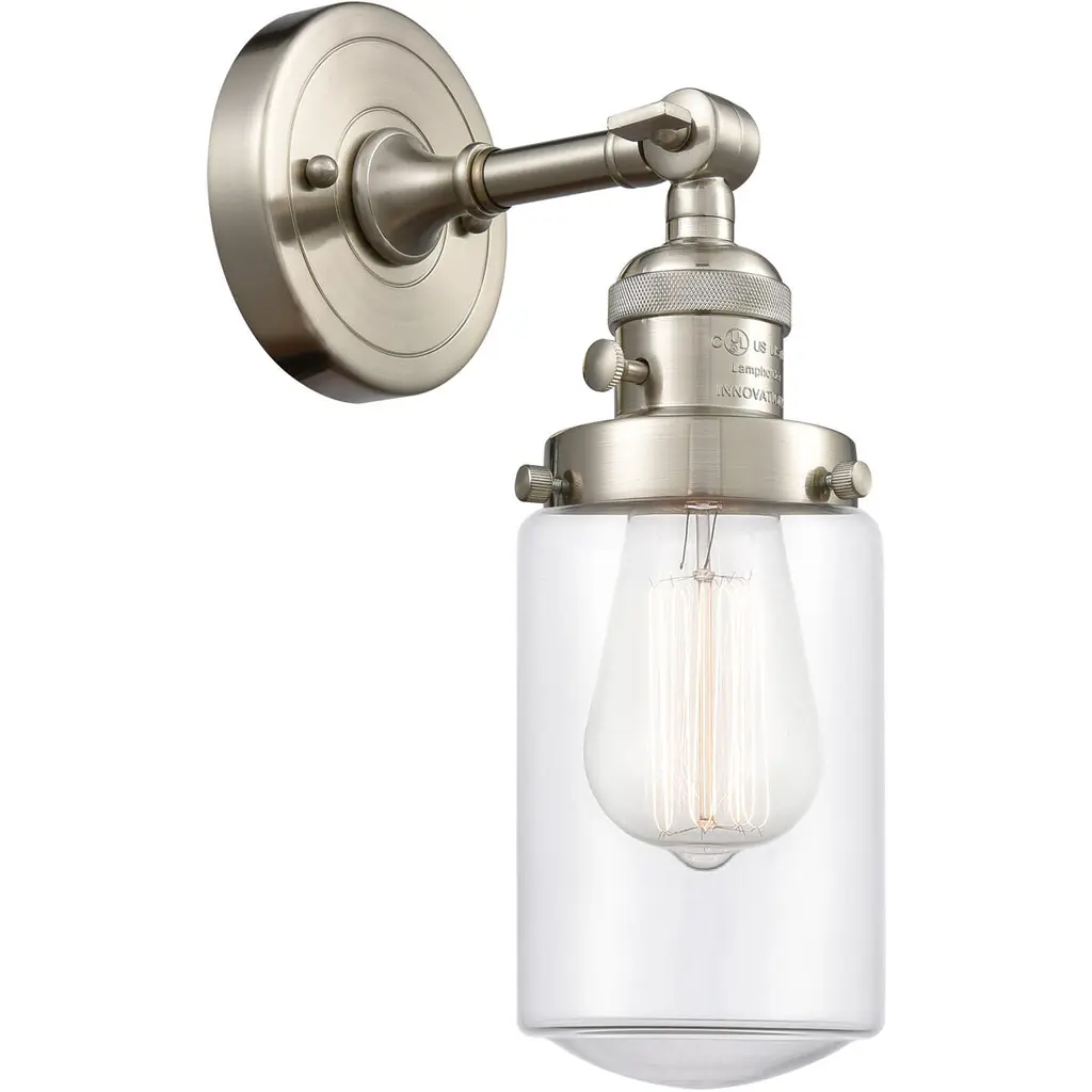 One of our largest and original collections, the Franklin Restoration is made up of a vast selection of heavy metal finishes and a large array of metal and glass shades that bring a touch of industrial into your home.Features:Solid brass 180 degree adjustable swivel with internal teeth that lock in at 5 degree intervals with engraved cast cup3 Way (High-Low-Off) switch included on socketFixture can be hung with bulbs facing up or down as a wall mount or facing down as a ceiling mount4.5 inch 2mm heavy cast backplateDistance from outlet opening to top of fixture 2.25 inchesRated for 100 watt maximumUL/CUL Damp RatedCompatible with Incandescent, LED, Fluorescent and Halogen bulbsNumber of Bulbs: 1Bulb Wattage: 3.5Bulb Type: LEDBulb Included: IncludedVoltage: 120Finish: Brushed Satin Nickel Finish Shade Finish: Clear Shade