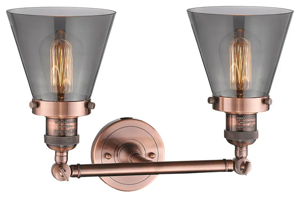 One of our largest and original collections, the Franklin Restoration is made up of a vast selection of heavy metal finishes and a large array of metal and glass shades that bring a touch of industrial into your home.Features:Fixture can be hung with bulbs facing up or down as a wall mountSolid brass 180 degree adjustable swivels with internal teeth that lock in at 5 degree intervalsRated for 100 watt maximum per socketUL/CUL and ETL/CETL damp ratedCompatible with incandescent, LED, fluorescent and halogen bulbs4.5 inch 2mm heavy cast backplateNumber of Bulbs: 2Bulb Wattage: 60Bulb Type: IncandescentBulb Included: NoVoltage: 120Finish: Polished Nickel Finish Shade Finish: Plated Smoke Shade