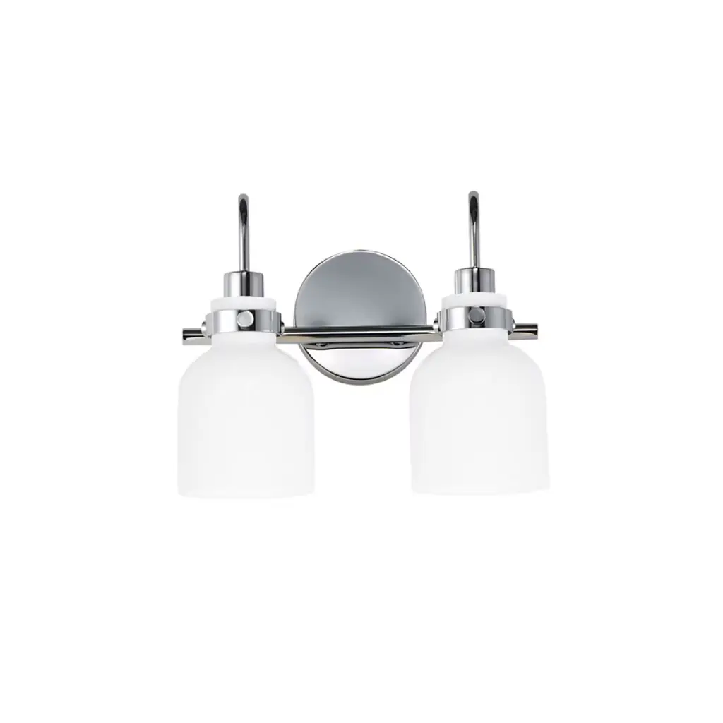 INNOVATIONS 900H-2W-PC-G51-LED Small Bell 2 Light Bath Vanity Light part of the Austere Collection Polished Chrome. Style: Industrial, Farmhouse, Restoration-Vintage, Traditional. Collection Name: Austere. Metal Finish(Body): Polished Chrome. Metal Finish(Canopy/Backplate): Polished Chrome. Material: Steel, Cast Brass, Glass. Dimension(in): 5(H) x 18.5(W) x 7.875(Ext). Bulb: (2)6W LED(Included). Voltage: 120. Dimmable: Yes. Color Temperature (Kelvin): 2700. Color Rendering Index (CRI): 82. Lumens: 600. Life Expectancy (Hours): 15000. Glass Shade Description: Matte White Cased Small Bell. Glass Type: Frosted. Shade Shape: Bell/Urn. Glass or Metal Shade Color: Matte White. Shade Material: Glass. Shade Dimension(in): 5(W) x 5.75(H). Fitter Measurement (Glass Or Metal Shade Fitter Size): 3.25 inch Fitter. Canopy Dimension(in): 4.5(Dia). Backplate Dimension(in): 4.5(Dia) x 0.75(Depth). California Proposition 65 Warning Required: Yes. UL/ETL Certification Type: Damp Location.