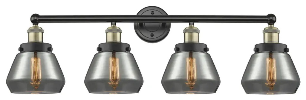One of our largest and original collections, the Franklin Restoration is made up of a vast selection of heavy metal finishes and a large array of metal and glass shades that bring a touch of industrial into your home.Features:Solid brass 180 degree adjustable swivels with internal teeth that lock in at 5 degree intervals with engraved cast cupRated for 100 watt maximum per socketUL/CUL Damp RatedCompatible with Incandescent, LED, Fluorescent and Halogen bulbsNumber of Bulbs: 4Bulb Wattage: 60Bulb Type: IncandescentBulb Included: Not IncludedVoltage: 120Finish: Black Antique Brass Finish Shade Finish: Plated Smoke Shade.