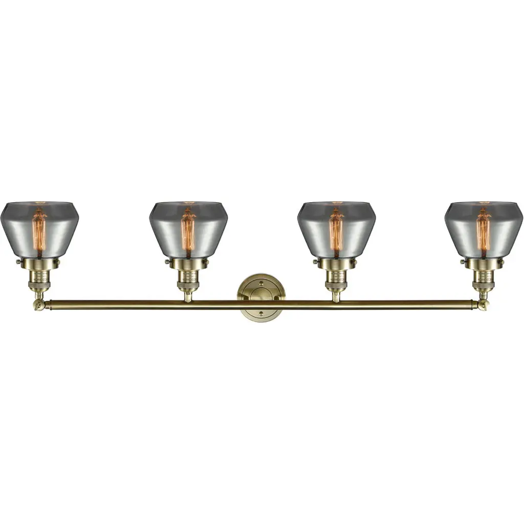 One of our largest and original collections, the Franklin Restoration is made up of a vast selection of heavy metal finishes and a large array of metal and glass shades that bring a touch of industrial into your home.Features:Solid brass 180 degree adjustable swivels with internal teeth that lock in at 5 degree intervals with engraved cast cupRated for 100 watt maximum per socketUL/CUL Damp RatedCompatible with Incandescent, LED, Fluorescent and Halogen bulbsNumber of Bulbs: 4Bulb Wattage: 100Bulb Type: IncandescentBulb Included: NoVoltage: 120Finish: Brushed Brass Finish Shade Finish: Plated Smoke Shade.