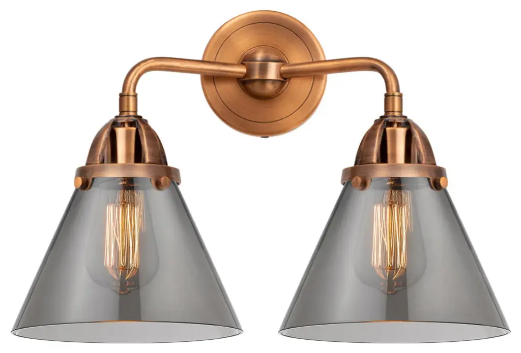 The Nouveau 2 is a highly detailed work of art that draws the eyes into its base and arm detail. The true show stopping piece is the beautifully curved glass shade that''s sure to wow you and guests alike.Features:Fixture can be hung with bulbs facing up or down4.5 inch 2mm heavy cast backplateDistance from outlet opening to top of fixture 2.25 inchesRated for 100 watt maximum per socketUL/CUL Damp RatedCompatible with Incandescent, LED, Fluorescent and Halogen bulbsNumber of Bulbs: 2Bulb Wattage: 60Bulb Type: IncandescentBulb Included: Not IncludedVoltage: 120Finish: Antique Copper, Plated Smoke