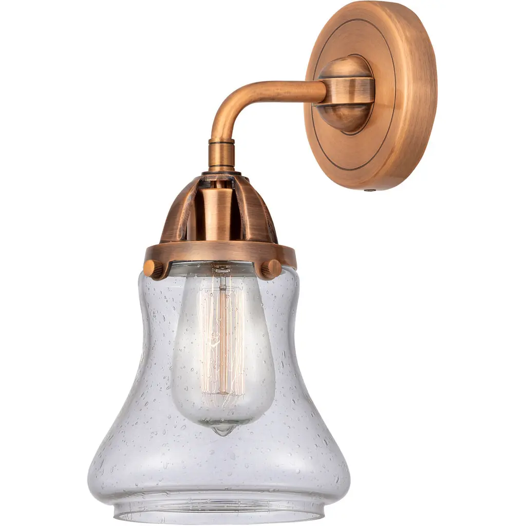 The Nouveau 2 is a highly detailed work of art that draws the eyes into its base and arm detail. The true show stopping piece is the beautifully curved glass shade that''s sure to wow you and guests alike.Features:Fixture can be hung with bulbs facing up or down4.5 inch 2mm heavy cast backplateDistance from outlet opening to top of fixture 2.25 inchesRated for 100 watt maximumUL/CUL Damp RatedCompatible with Incandescent, LED, Fluorescent and Halogen bulbsNumber of Bulbs: 1Bulb Wattage: 3.5Bulb Type: LEDBulb Included: IncludedVoltage: 120Finish: Brushed Brass, Seedy