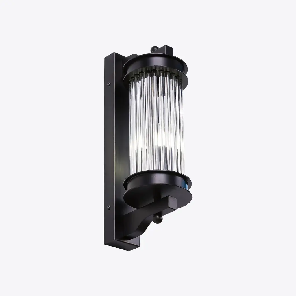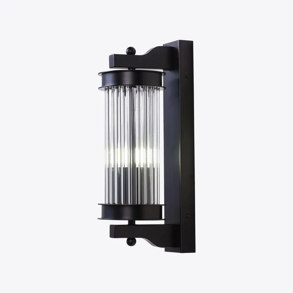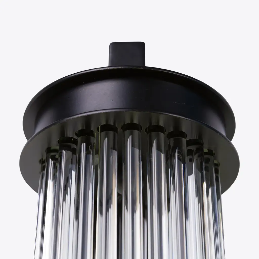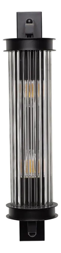 The Elon wall light is an Art Deco inspired wall sconce formed from rods of clear glass held within a symmetrical black frame. This versatile light is perfect for hallways and living areas. Numbered, Up to 250V (Europe/UK Standard).