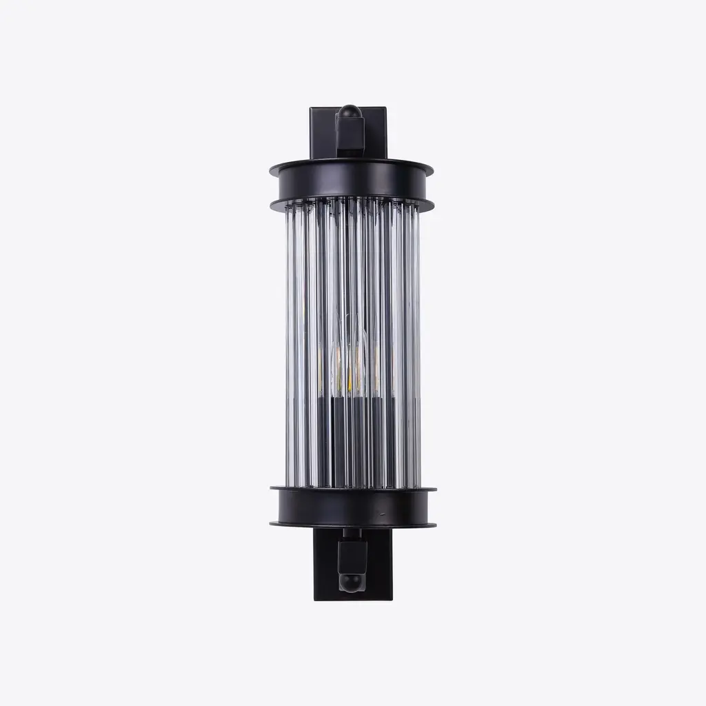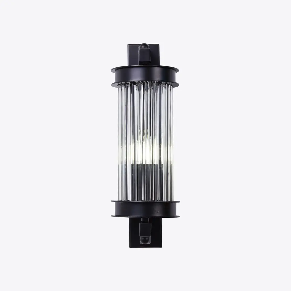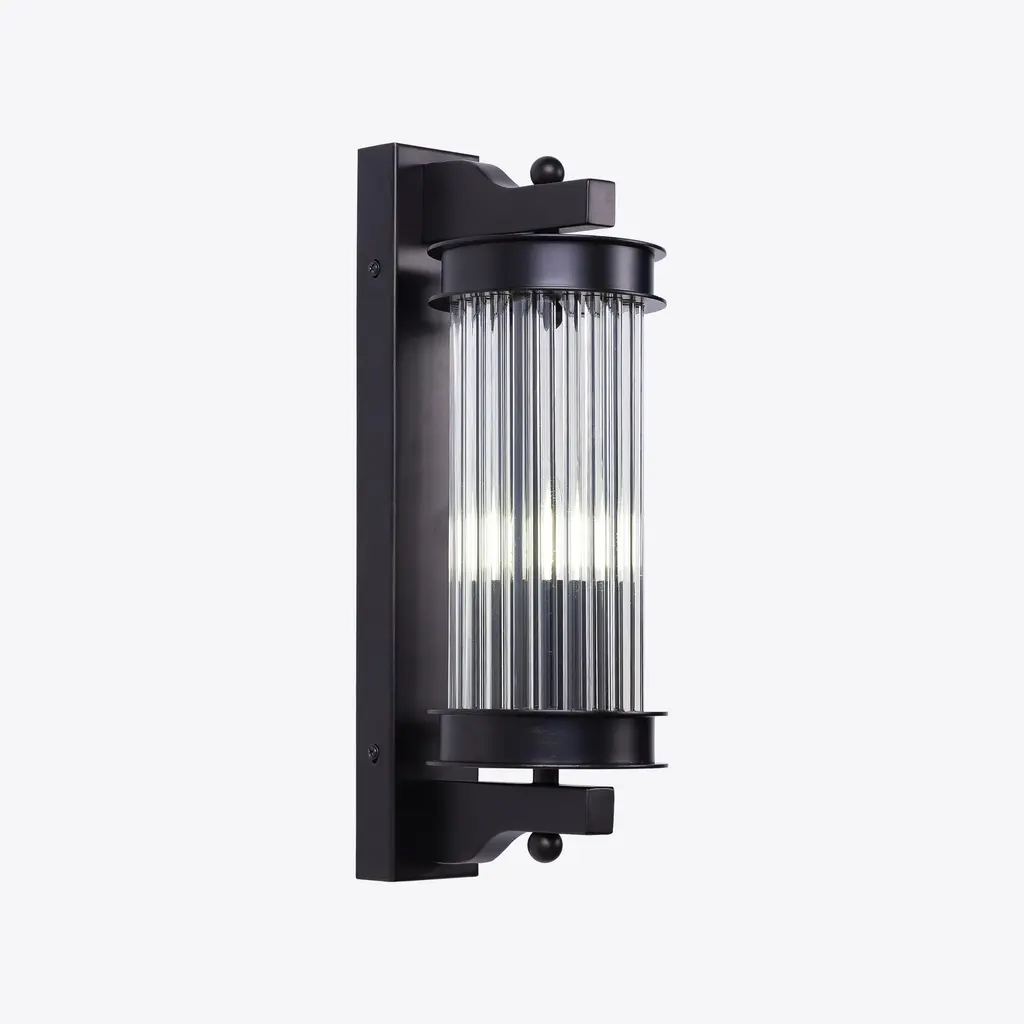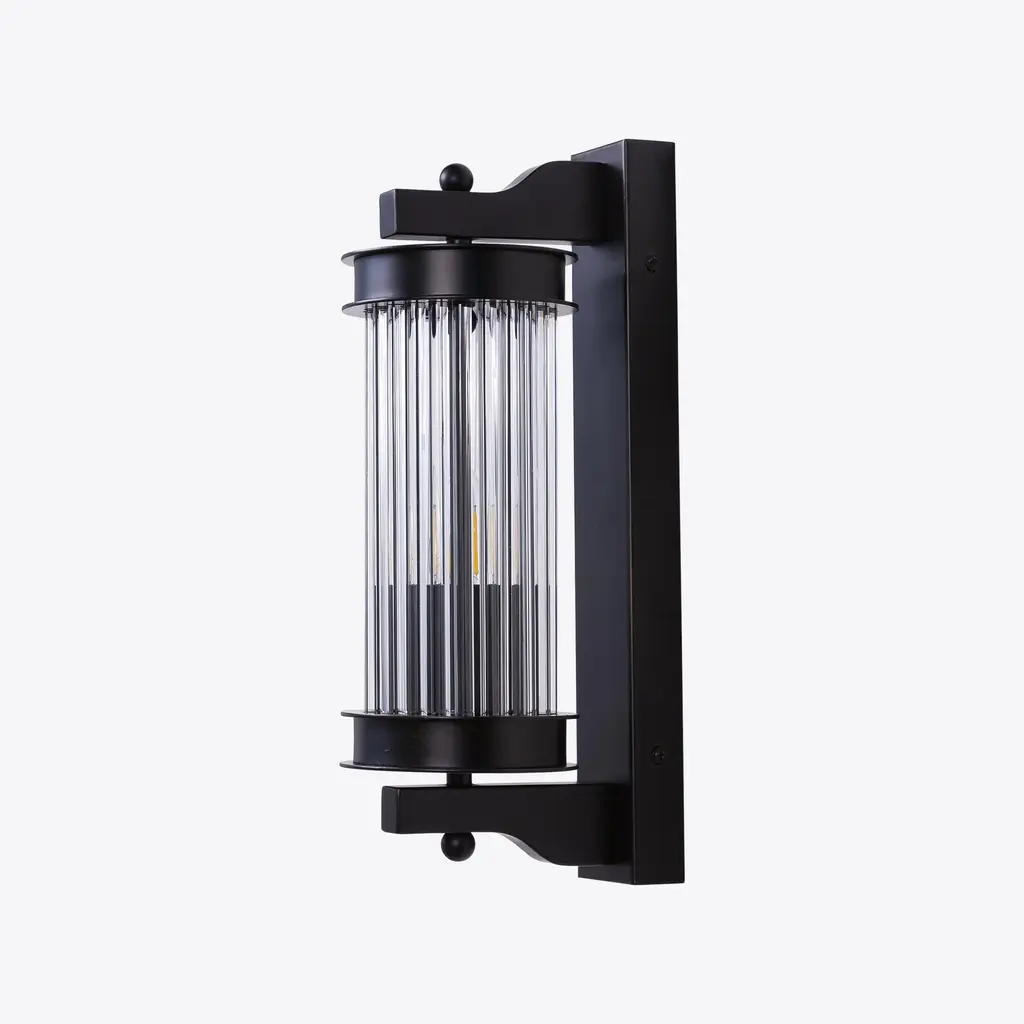 The Elon wall light is an Art Deco inspired wall sconce formed from rods of clear glass held within a symmetrical black frame. This versatile light is perfect for hallways and living areas. Numbered, Up to 250V (Europe/UK Standard).