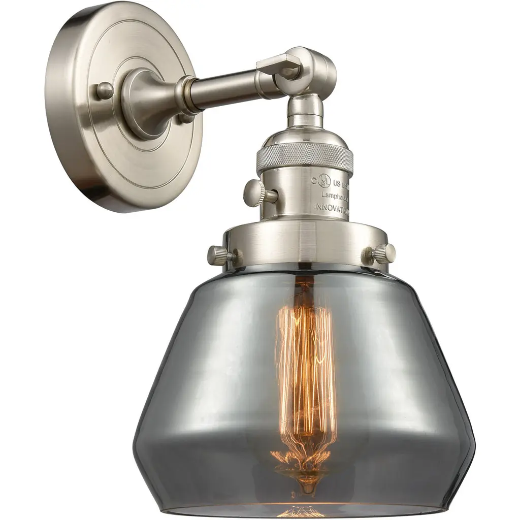 One of our largest and original collections, the Franklin Restoration is made up of a vast selection of heavy metal finishes and a large array of metal and glass shades that bring a touch of industrial into your home.Features:Solid brass 180 degree adjustable swivel with internal teeth that lock in at 5 degree intervals, and engraved cast cup3 way (High-Low-Off) switch included on socketFixture can be hung with bulbs facing up or down as a wall mount, or facing down as a ceiling mountDistance from outlet opening to top of fixture 2.25 inchRated for 100 watt maximumUL/CUL and ETL/CETL damp ratedCompatible with incandescent, LED, fluorescent and halogen bulbsNumber of Bulbs: 1Bulb Wattage: 60Bulb Type: IncandescentBulb Included: NoVoltage: 120Finish: Brushed Satin Nickel Finish Shade Finish: Plated Smoke Shade.