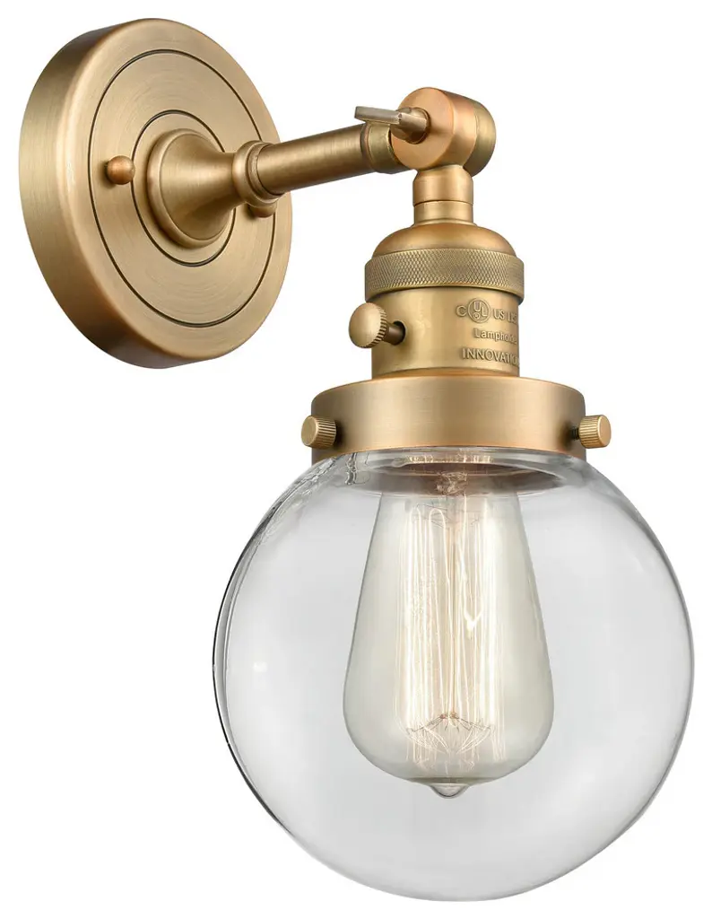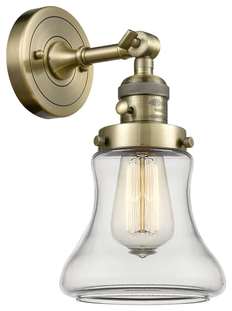 One of our largest and original collections, the Franklin Restoration is made up of a vast selection of heavy metal finishes and a large array of metal and glass shades that bring a touch of industrial into your home.Features:Solid brass 180 degree adjustable swivel with internal teeth that lock in at 5 degree intervals, and engraved cast cupFixture can be hung with bulbs facing up or down as a wall mount, or facing down as a ceiling mount4.5 inch 2mm heavy cast backplateDistance from outlet opening to top of fixture 2.25 inchesRated for 100 watt maximumUL/CUL and ETL/CETL damp ratedCompatible with incandescent, LED, fluorescent and halogen bulbsNumber of Bulbs: 1Bulb Wattage: 60Bulb Type: IncandescentBulb Included: NoVoltage: 120Finish: Polished Chrome Finish Shade Finish: Clear Shade.