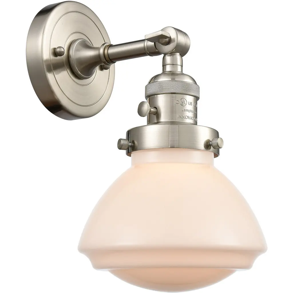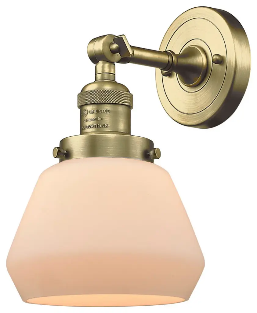 One of our largest and original collections, the Franklin Restoration is made up of a vast selection of heavy metal finishes and a large array of metal and glass shades that bring a touch of industrial into your home.Features:Solid brass 180 degree adjustable swivel with internal teeth that lock in at 5 degree intervals, and engraved cast cupFixture can be hung with bulbs facing up or down as a wall mount, or facing down as a ceiling mount4.5 inch 2mm heavy cast backplateDistance from outlet opening to top of fixture 2.25 inchesRated for 100 watt maximumUL/CUL and ETL/CETL damp ratedCompatible with incandescent, LED, fluorescent and halogen bulbsNumber of Bulbs: 1Bulb Wattage: 60Bulb Type: IncandescentBulb Included: NoVoltage: 120Finish: Brushed Satin Nickel Finish Shade Finish: Matte White Shade.