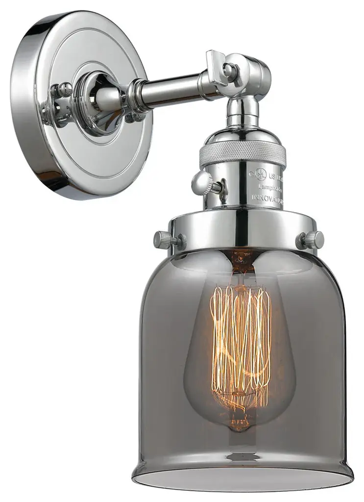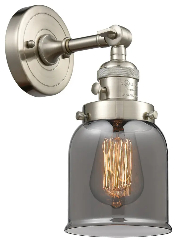 One of our largest and original collections, the Franklin Restoration is made up of a vast selection of heavy metal finishes and a large array of metal and glass shades that bring a touch of industrial into your home.Features:Solid brass 180 degree adjustable swivel with internal teeth that lock in at 5 degree intervals, and engraved cast cupFixture can be hung with bulbs facing up or down as a wall mount, or facing down as a ceiling mount4.5 inch 2mm heavy cast backplateDistance from outlet opening to top of fixture 2.25 inchesRated for 100 watt maximumUL/CUL and ETL/CETL damp ratedCompatible with incandescent, LED, fluorescent and halogen bulbsNumber of Bulbs: 1Bulb Wattage: 60Bulb Type: IncandescentBulb Included: NoVoltage: 120Finish: Polished Nickel Finish Shade Finish: Plated Smoke Shade
