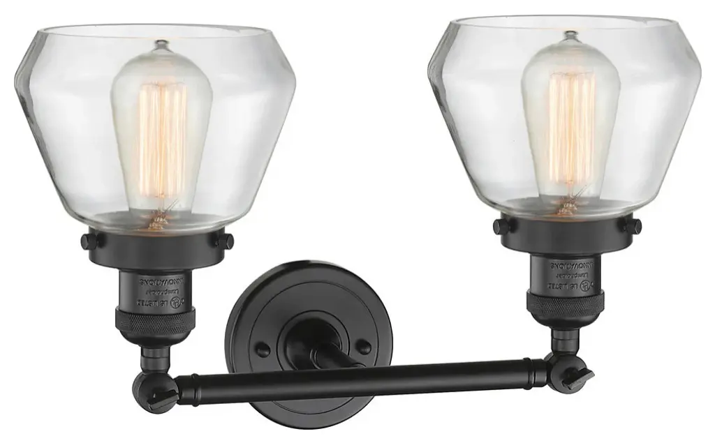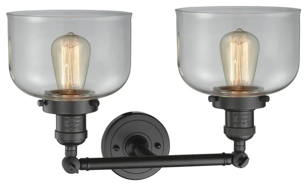 One of our largest and original collections, the Franklin Restoration is made up of a vast selection of heavy metal finishes and a large array of metal and glass shades that bring a touch of industrial into your home.Features:Fixture can be hung with bulbs facing up or down as a wall mountSolid brass 180 degree adjustable swivels with internal teeth that lock in at 5 degree intervalsRated for 100 watt maximum per socketUL/CUL and ETL/CETL damp ratedCompatible with incandescent, LED, fluorescent and halogen bulbs4.5 inch 2mm heavy cast backplateNumber of Bulbs: 2Bulb Wattage: 60Bulb Type: IncandescentBulb Included: NoVoltage: 120Finish: Matte Black Finish Shade Finish: Clear Shade