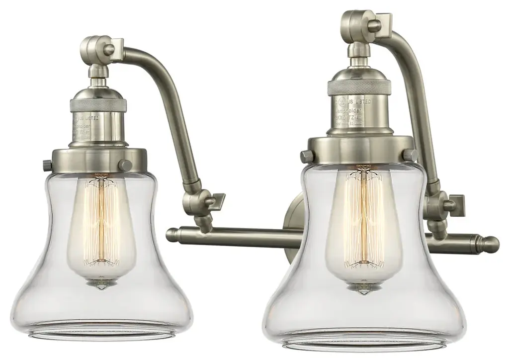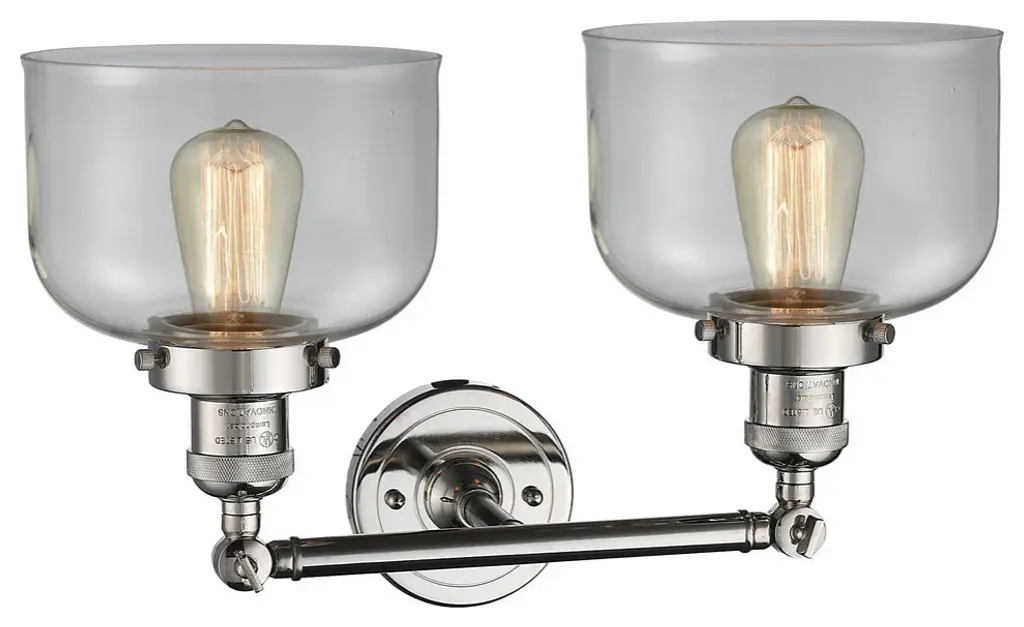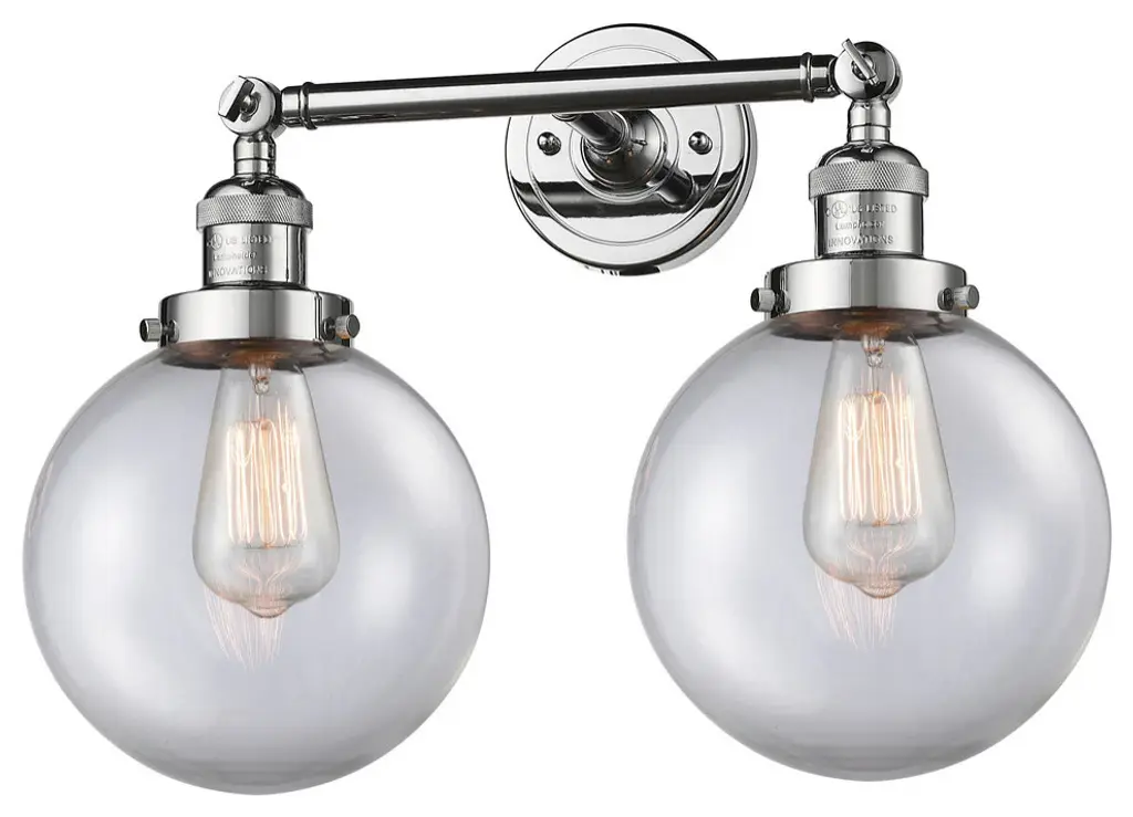 One of our largest and original collections, the Franklin Restoration is made up of a vast selection of heavy metal finishes and a large array of metal and glass shades that bring a touch of industrial into your home.Features:Fixture can be hung with bulbs facing up or down as a wall mountSolid brass 180 degree adjustable swivels with internal teeth that lock in at 5 degree intervalsRated for 100 watt maximum per socketUL/CUL and ETL/CETL damp ratedCompatible with incandescent, LED, fluorescent and halogen bulbs4.5 inch 2mm heavy cast backplateNumber of Bulbs: 2Bulb Wattage: 60Bulb Type: IncandescentBulb Included: NoVoltage: 120Finish: Polished Chrome Finish Shade Finish: Clear Shade