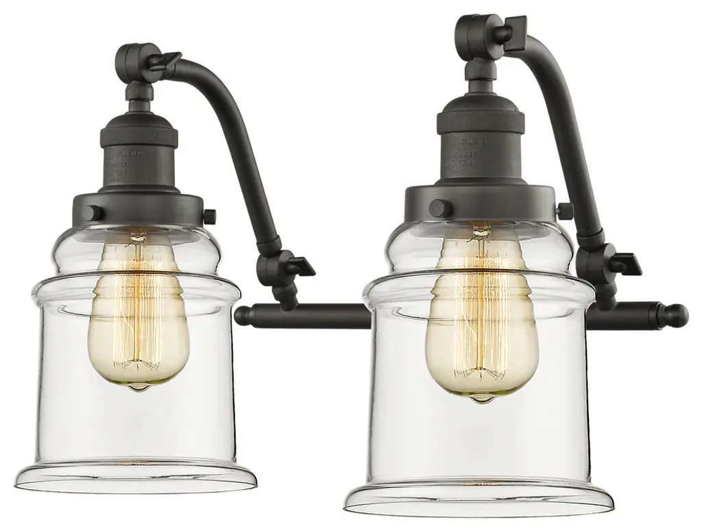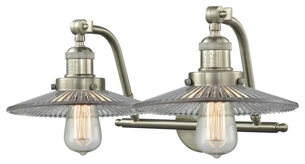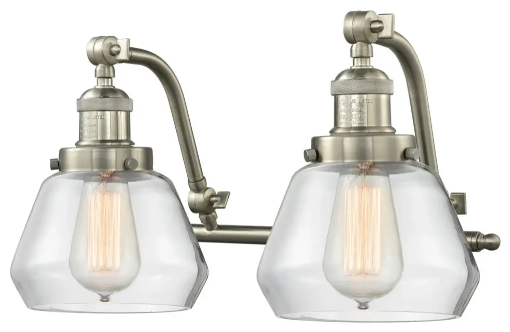 One of our largest and original collections, the Franklin Restoration is made up of a vast selection of heavy metal finishes and a large array of metal and glass shades that bring a touch of industrial into your home.Features:Solid brass 180 degree adjustable swivels with internal teeth that lock in at 5 degree intervalsFixture can be hung with bulbs facing up or down4.5 inch 2mm heavy cast backplateDouble Swivel seriesDistance from outlet opening to top of fixture 10.13 inchesRated for 100 watt maximum per socketUL/CUL Damp RatedCompatible with Incandescent, LED, Fluorescent and Halogen bulbsNumber of Bulbs: 2Bulb Wattage: 100Bulb Type: IncandescentBulb Included: NoVoltage: 120Finish: Brushed Satin Nickel Finish Shade Finish: Clear Shade.