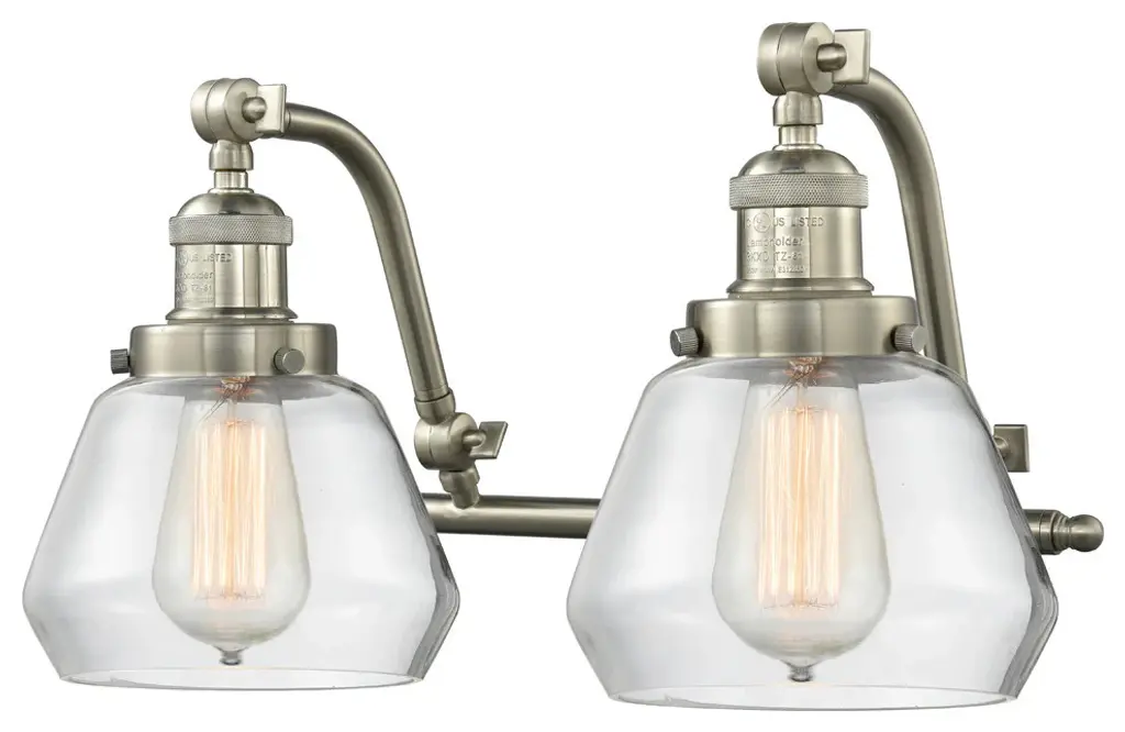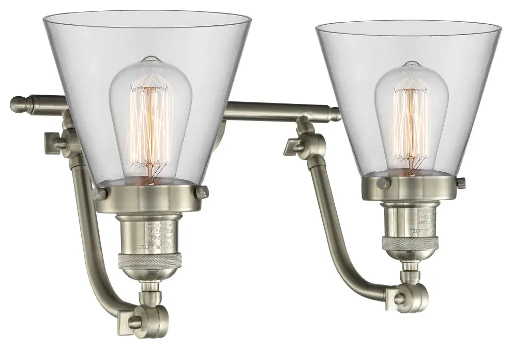 Small Cone 2-Light Bath Fixture, Clear Glass, Satin Brush Nickel, Incandescent