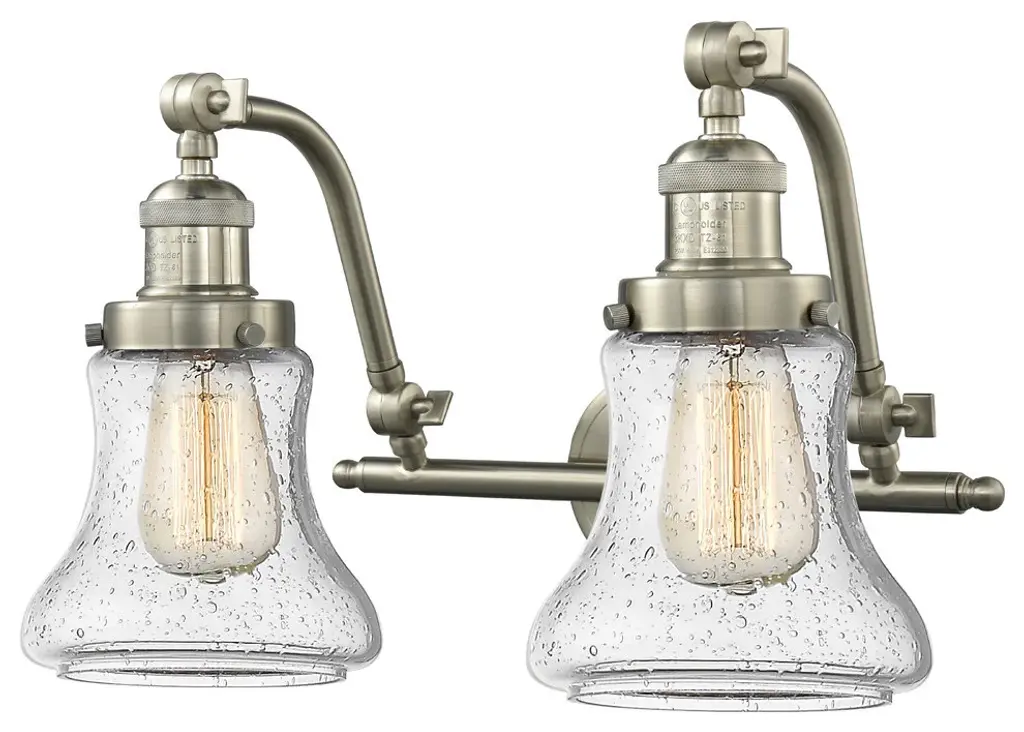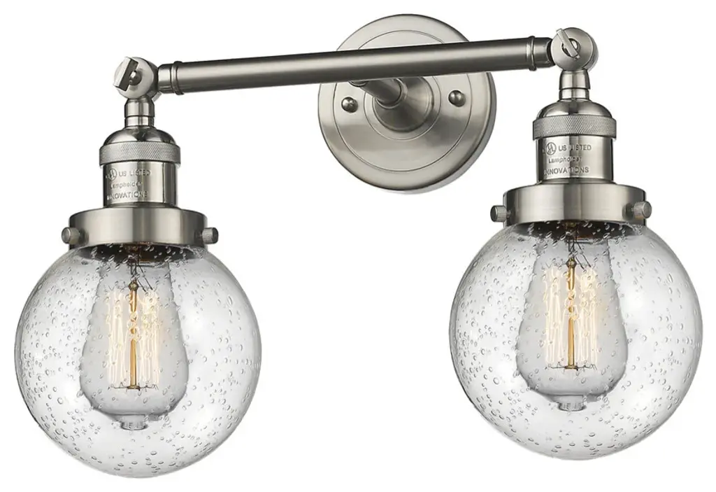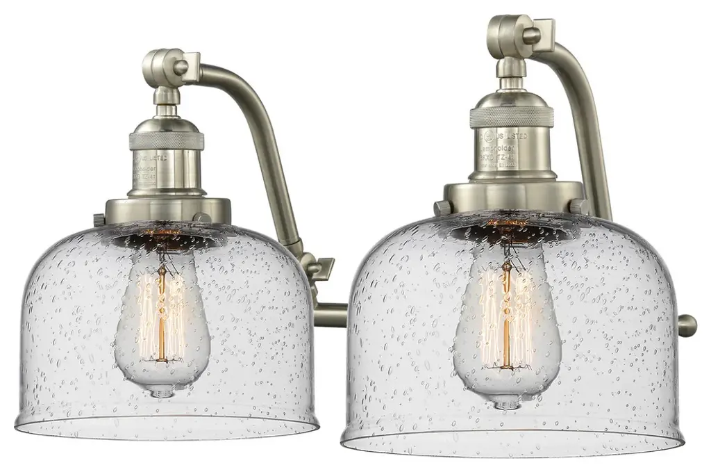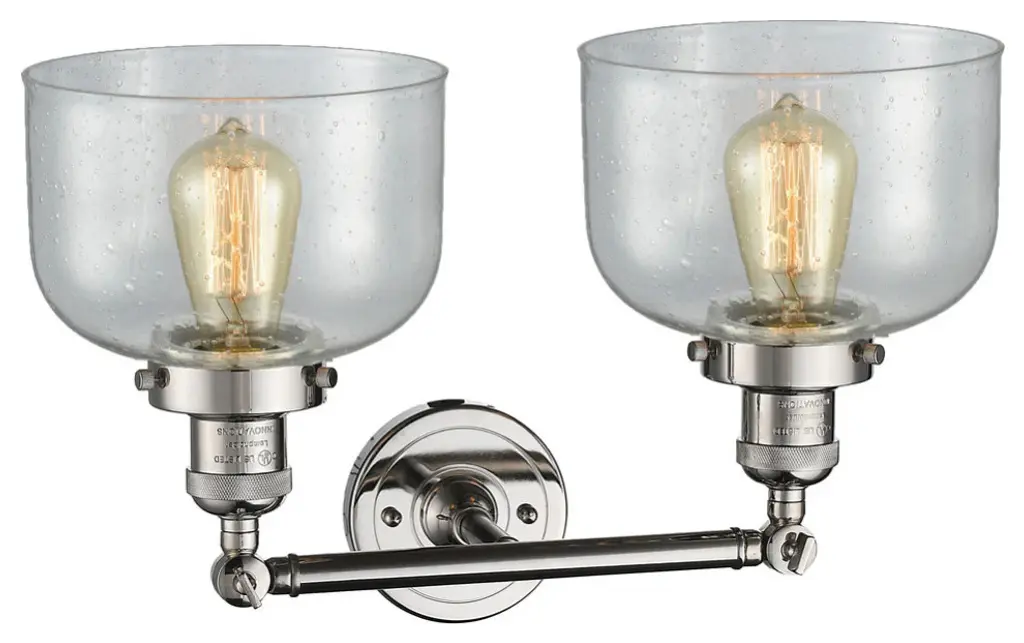 One of our largest and original collections, the Franklin Restoration is made up of a vast selection of heavy metal finishes and a large array of metal and glass shades that bring a touch of industrial into your home.Features:Fixture can be hung with bulbs facing up or down as a wall mountSolid brass 180 degree adjustable swivels with internal teeth that lock in at 5 degree intervalsRated for 100 watt maximum per socketUL/CUL and ETL/CETL damp ratedCompatible with incandescent, LED, fluorescent and halogen bulbs4.5 inch 2mm heavy cast backplateNumber of Bulbs: 2Bulb Wattage: 60Bulb Type: IncandescentBulb Included: NoVoltage: 120Finish: Polished Nickel Finish Shade Finish: Seedy Shade