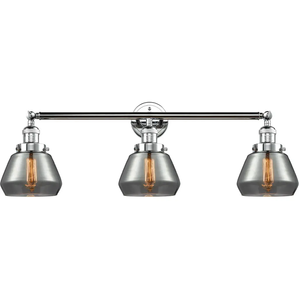 One of our largest and original collections, the Franklin Restoration is made up of a vast selection of heavy metal finishes and a large array of metal and glass shades that bring a touch of industrial into your home.Features:Solid brass 180 degree adjustable swivels with internal teeth that lock in at 5 degree intervals with engraved cast cupFixture can be hung with bulbs facing up or down4.5 inch 2mm heavy cast backplateDistance from outlet opening to top of fixture 2.25 inchesRated for 100 watt maximum per socketUL/CUL Damp RatedCompatible with Incandescent, LED, Fluorescent and Halogen bulbsNumber of Bulbs: 3Bulb Wattage: 60Bulb Type: IncandescentBulb Included: Not IncludedVoltage: 120Finish: Polished Chrome Finish Shade Finish: Plated Smoke Shade.