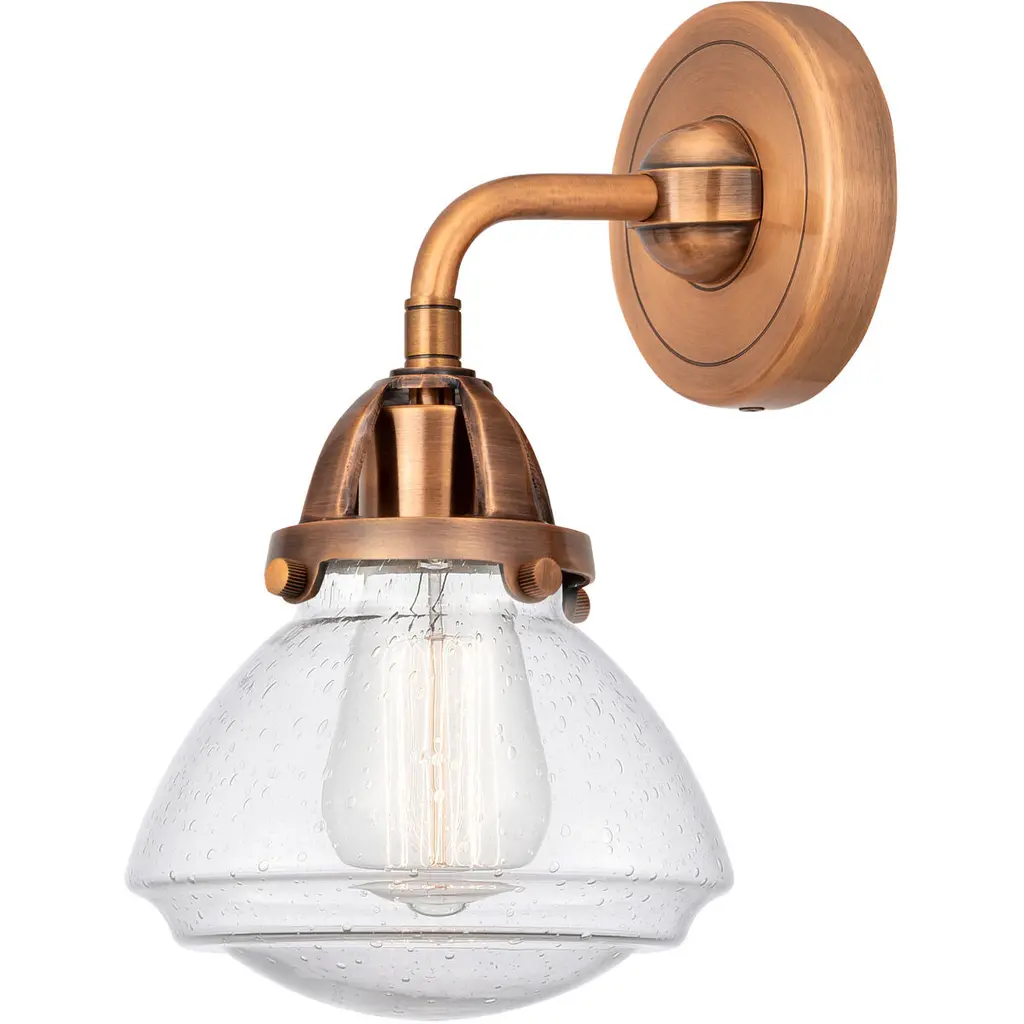 The Nouveau 2 is a highly detailed work of art that draws the eyes into its base and arm detail. The true show stopping piece is the beautifully curved glass shade that''s sure to wow you and guests alike.Features:Fixture can be hung with bulbs facing up or down4.5 inch 2mm heavy cast backplateDistance from outlet opening to top of fixture 2.25 inchesRated for 100 watt maximumUL/CUL Damp RatedCompatible with Incandescent, LED, Fluorescent and Halogen bulbsNumber of Bulbs: 1Bulb Wattage: 3.5Bulb Type: LEDBulb Included: IncludedVoltage: 120Finish: Antique Copper, Seedy