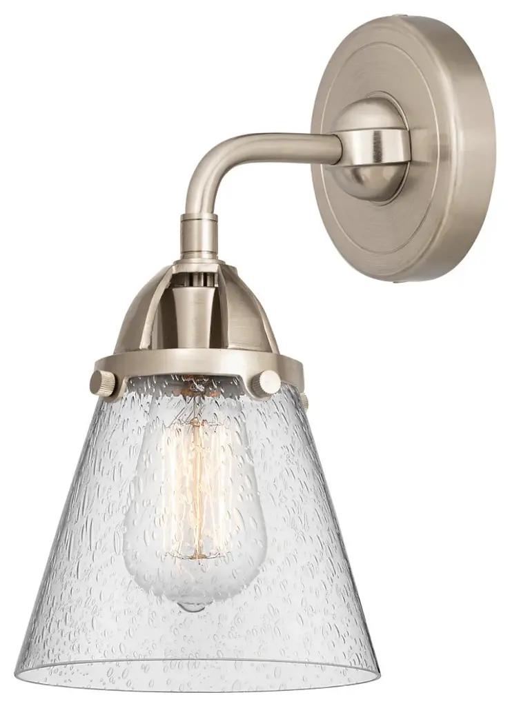 The Nouveau 2 is a highly detailed work of art that draws the eyes into its base and arm detail. The true show stopping piece is the beautifully curved glass shade that''s sure to wow you and guests alike.Features:Fixture can be hung with bulbs facing up or down4.5 inch 2mm heavy cast backplateDistance from outlet opening to top of fixture 2.25 inchesRated for 100 watt maximumUL/CUL Damp RatedCompatible with Incandescent, LED, Fluorescent and Halogen bulbsNumber of Bulbs: 1Bulb Wattage: 60Bulb Type: IncandescentBulb Included: Not IncludedVoltage: 120Finish: Polished Chrome, Seedy