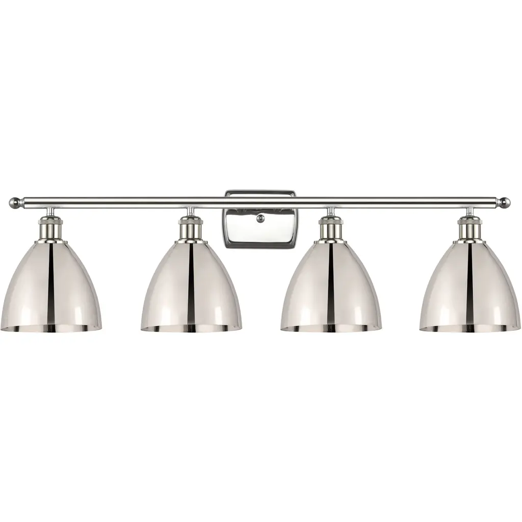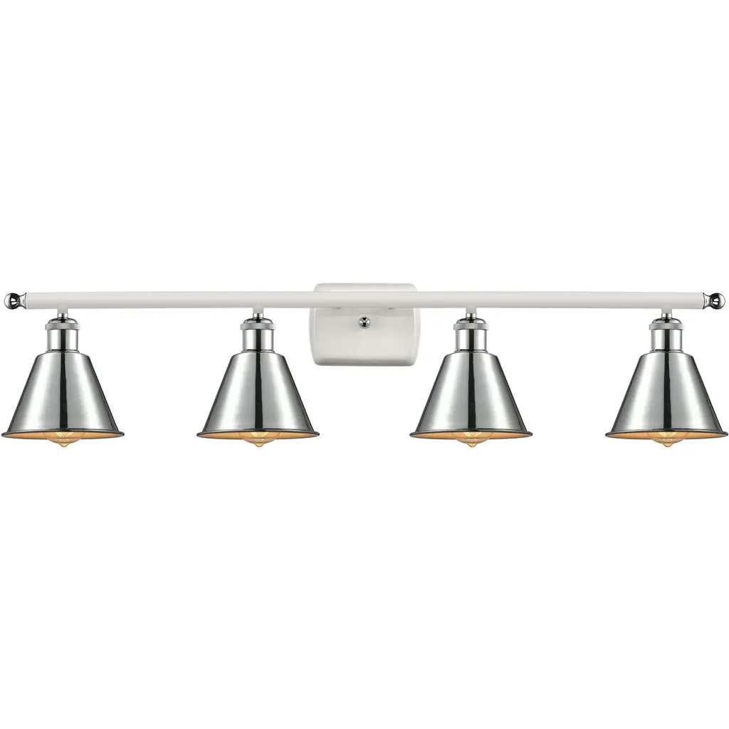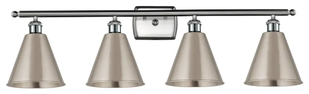 INNOVATIONS 616-4W-PC-M8-PC Smithfield 4 Light Bath Vanity Light part of the Ballston Collection Polished Chrome. Style: Industrial, Farmhouse, Restoration-Vintage. Collection Name: Ballston. Metal Finish(Body): Polished Chrome. Metal Finish(Shade): Polished Chrome. Metal Finish(Canopy/Backplate): Polished Chrome. Material: Steel, Cast Brass. Dimension(in): 9.75(H) x 33.5(W) x 7.75(Ext). Bulb: (4)60W Medium Base Incandescent(Not Included). Voltage: 120. Dimmable: Yes. Color Temperature (Kelvin): 2200. Color Rendering Index (CRI): 99.9. Lumens: 220. Life Expectancy (Hours): 2000. Shade Shape: Cone. Glass or Metal Shade Color: Polished Chrome. Shade Material: Metal. Metal Shade Description: Polished Chrome Smithfield. Shade Dimension(in): 6.5(W) x 4.5(H). Fitter Measurement (Glass Or Metal Shade Fitter Size): Neckless with a 1.75 inch opening. Backplate Dimension(in): 4.5(H) x 6(W) x 0.75(Depth). California Proposition 65 Warning Required: Yes. UL/ETL Certification Type: Damp Location.