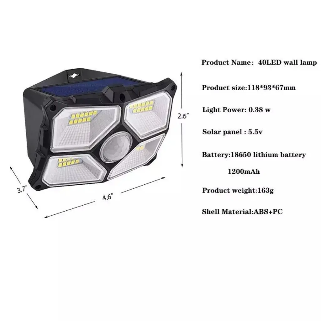 Ultra Bright 40-LED Lighting-Equipped with 40 high-intensity LEDs to deliver wide-area illumination, perfect for patios, driveways, gardens, and walkways. Smart Solar Charging & Auto Operation-Powered by an efficient 5.5V solar panel, charges during the day and turns on automatically at dusk—no wiring or electricity costs. IP65 Waterproof & Weather Resistant-Built to withstand harsh outdoor conditions including rain, snow, and extreme heat, making it ideal for year-round use. Long-Lasting Battery Performance-Includes a 1200mAh rechargeable lithium battery for consistent, extended lighting through the night. Easy Installation, No Wiring Needed-Wireless, tool-free setup—mount on any wall, fence, or flat outdoor surface in minutes. Perfect for garages, porches, backyards, and more.