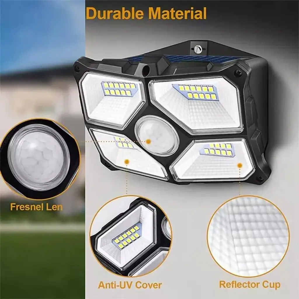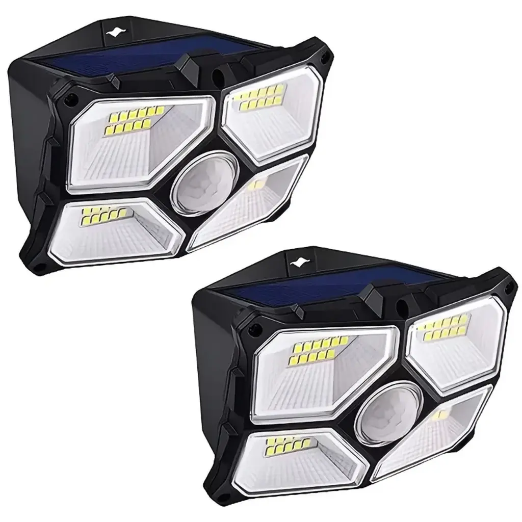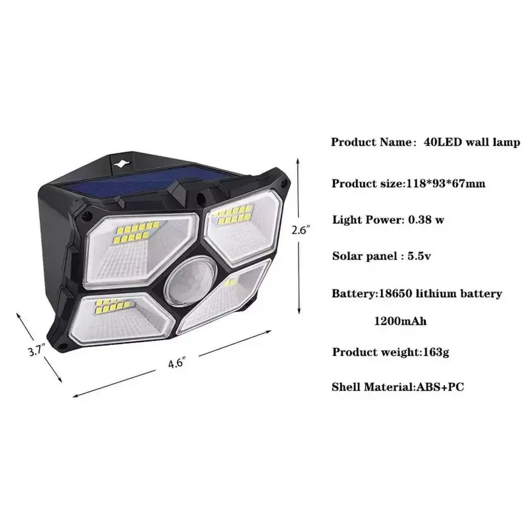 Ultra-Bright 40LED Solar Outdoor Security Lights - Each light features 40 high-lumen LEDs to brighten front doors, garages, yards, and pathways—ideal for enhancing safety at night. High-Efficiency Solar Panel with Auto On/Off - These motion sensor lights charge via a 5.5V solar panel and automatically activate at dusk—no wiring or electricity needed. Durable, Weatherproof Design for Year-Round Use - Built with IP65 waterproof housing, these outdoor lights are made to withstand rain, heat, and snow—perfect for garage walls or garden fences. Long-Lasting 1200mAh Battery for Extended Illumination - Enjoy reliable overnight lighting with a rechargeable lithium battery—great for driveways, porches, and outdoor entryways. Quick, Wire-Free Installation Anywhere Outdoors - Install easily on any wall, deck, or patio with screws or adhesive. These solar wall lights are ideal for front doors, backyards, or even barns.