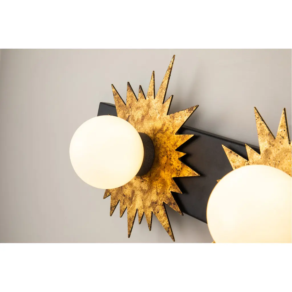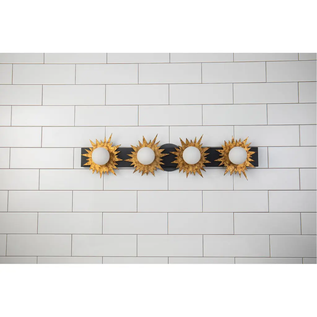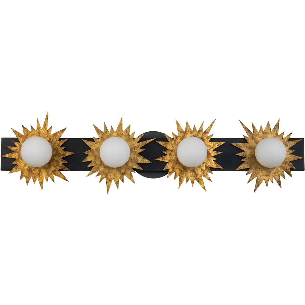 Looking to lighten up your space with a whimsical and art-inspired piece? Designed using a statement-making sun shape , this four-light bath bar is the favorite pick for installing over double sinks or your favorite mirrors. Creating an eye-catching focal point, this 4- light star shaped wall lantern is unique enough to work in the most sophisticated spaces, and using the mixed metal finishes, will give texture, depth, and add a little more drama to your bathroom space. Measuring 32" in length, 8.5" in height and 4.5" in depth, the Soleil bathroom light can easily fit in any of your favorite spaces.