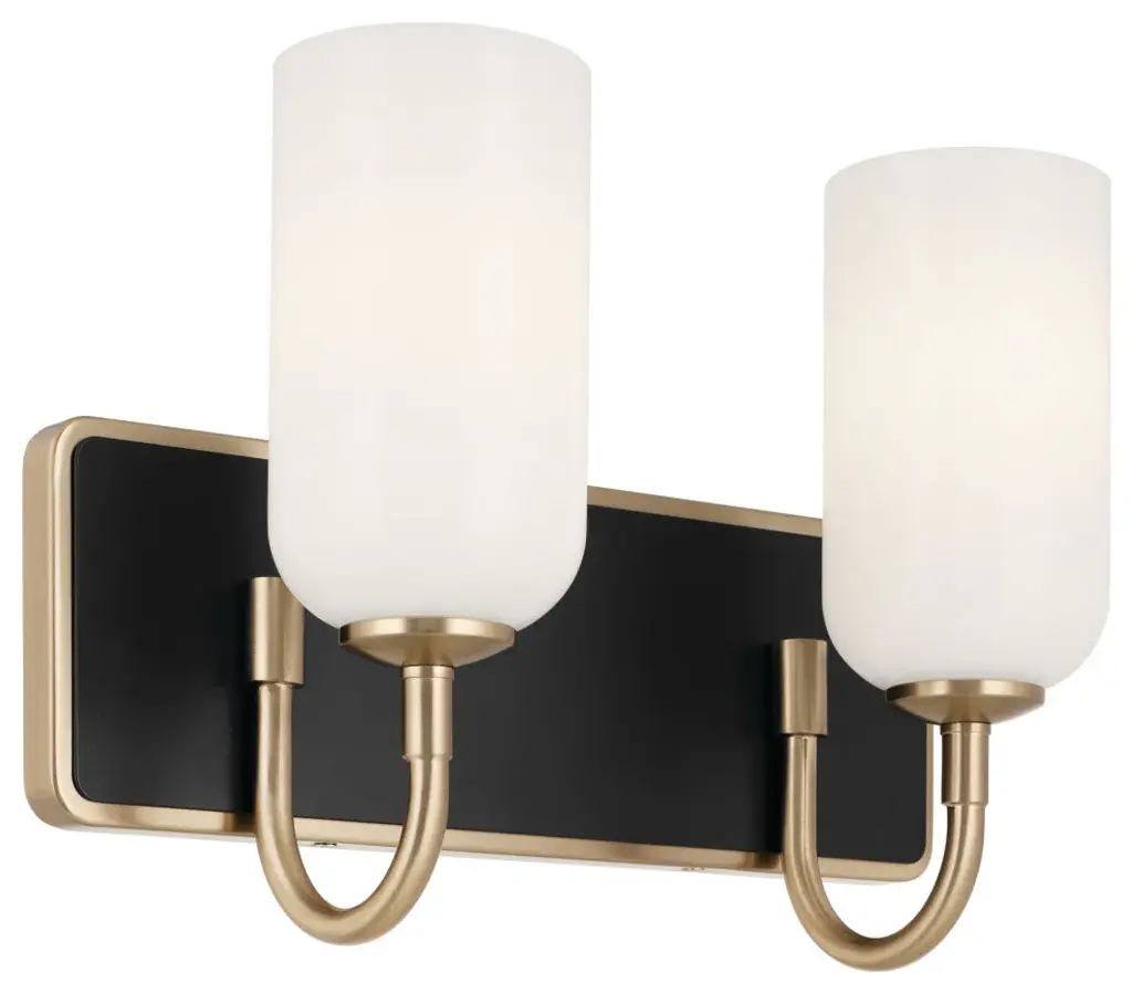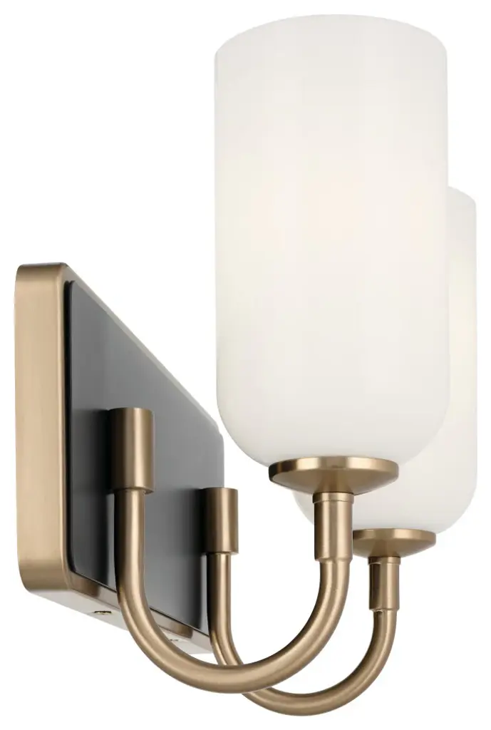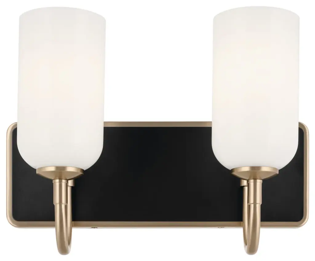Inspired by simplicity, the Solia 2 light vanity dual-finished champagne bronze and black backplate adds visual interest. Solia''s refined opal glass illuminates in modern sophistication.