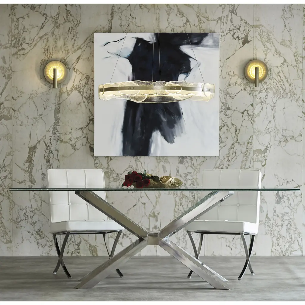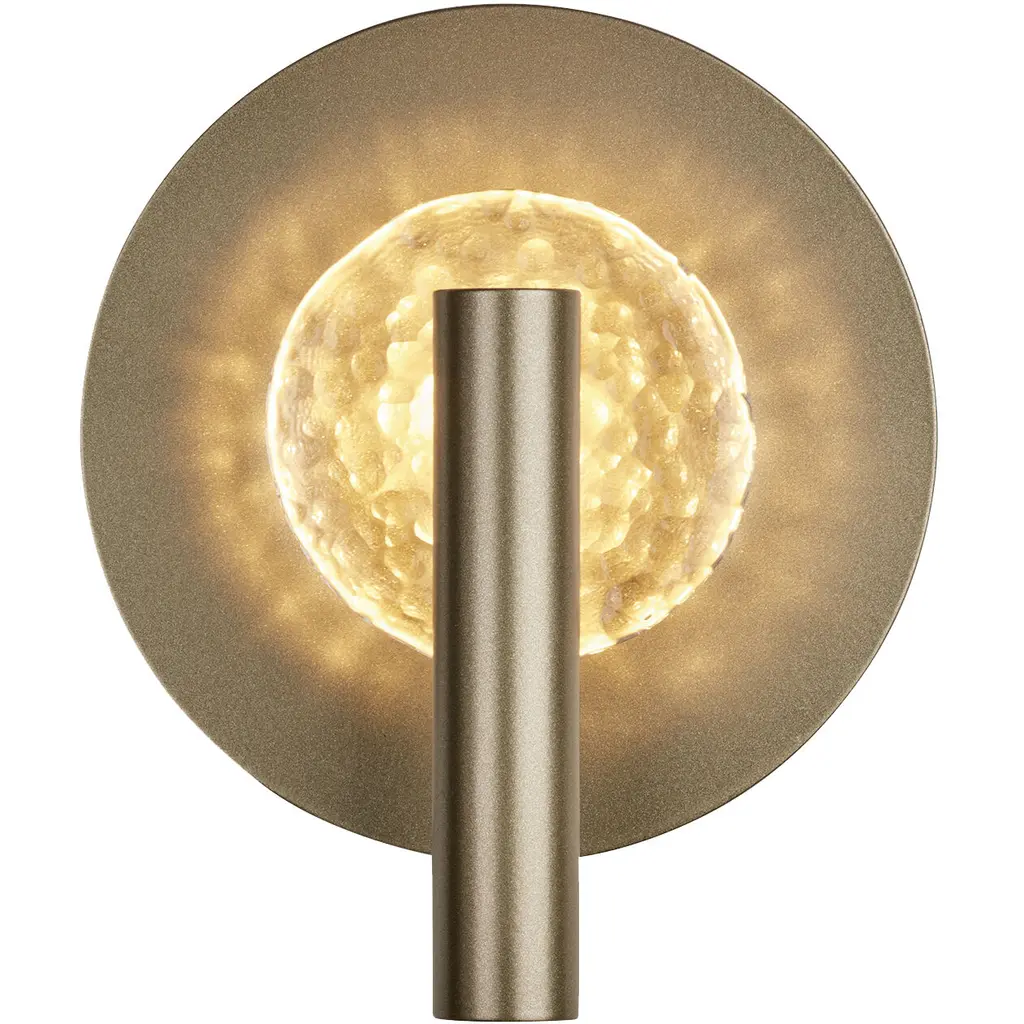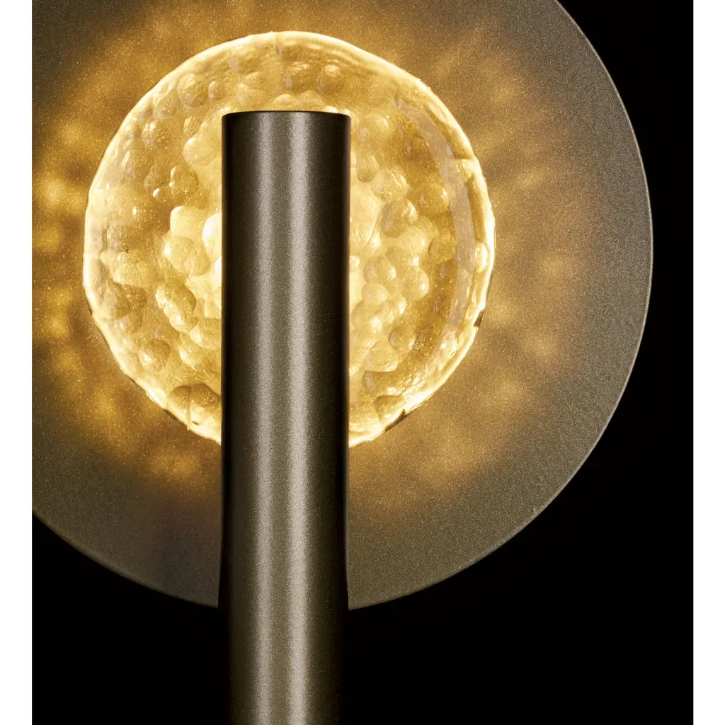 The beauty is in the details. The light is focused on a hand-poured, textured artisanal glass disc creating a unique glowing aura of light on its circular backplate.