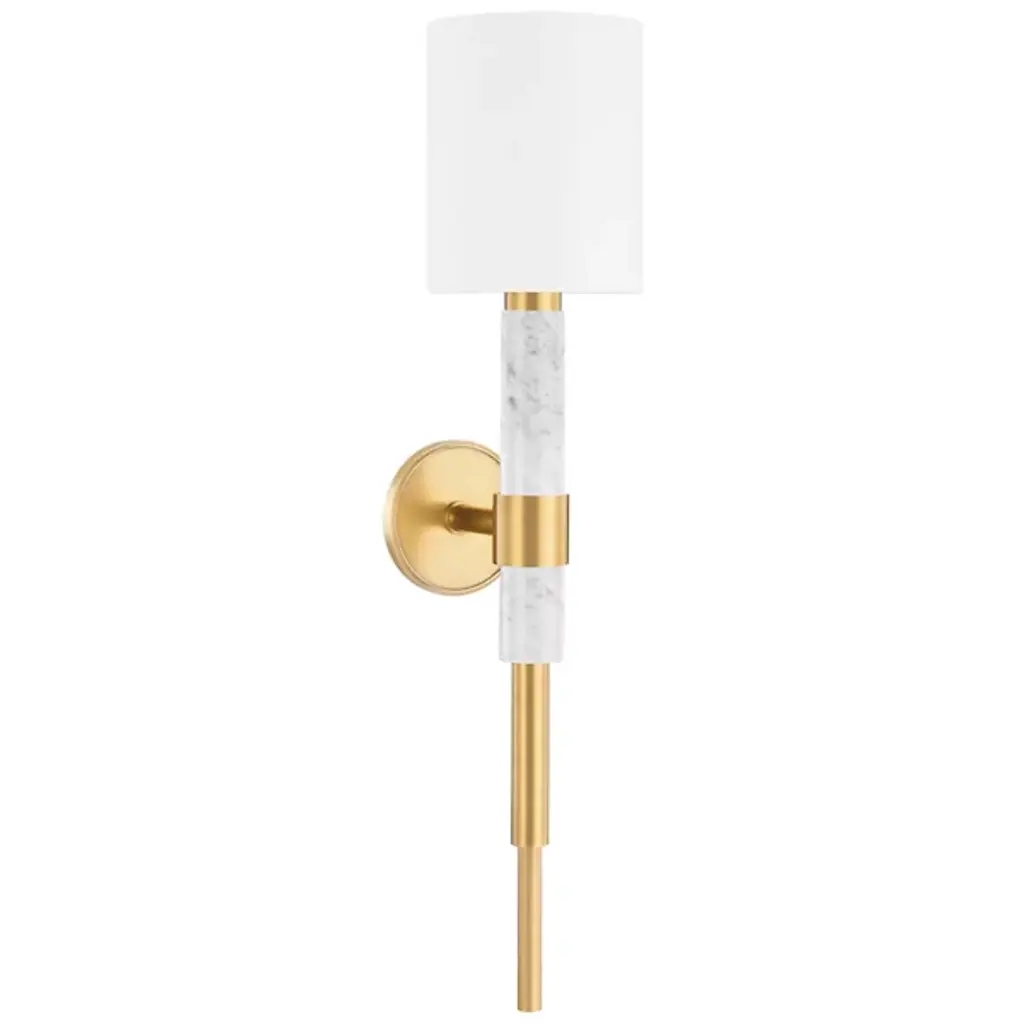 Presented by Corbett Lighting, the Solstice Wall Sconce is a transitionally designed luxury light furnishing. It features marble accents as well as vintage brass metalwork. Completing the composition is a lovely white linen shade for a pleasant diffusion of light. You can place them on the wall in spaces that would benefit from the illumination and elevated look. This sconce is suitable for any interior as well as outdoor locales protected from the elements.