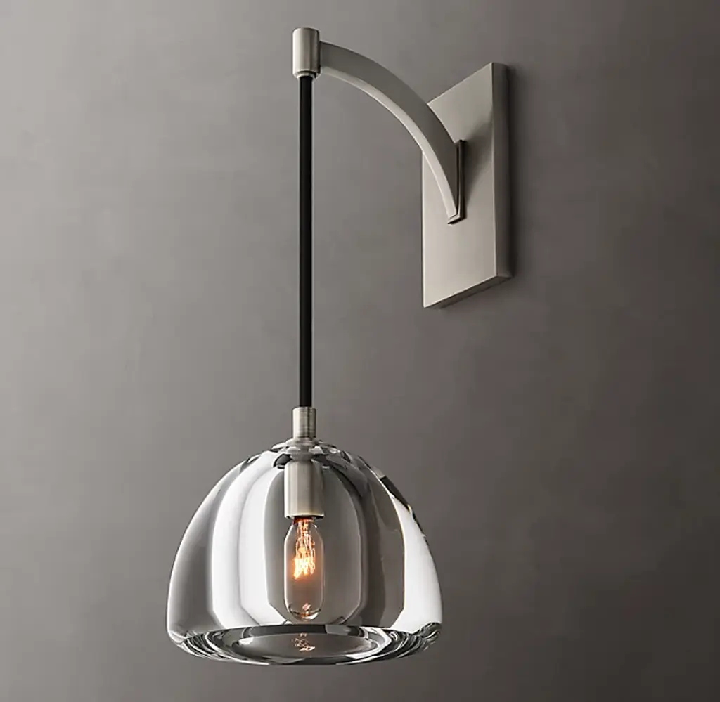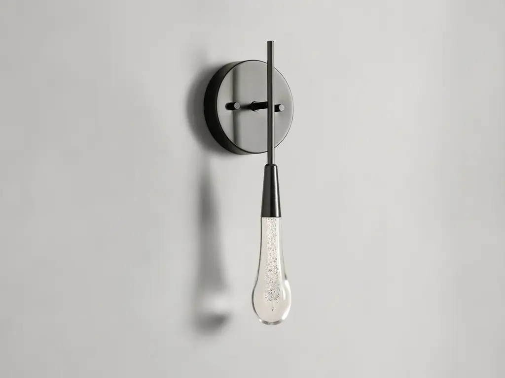 Featuring a sleek metal arm cascading into an integrated LED light handcrafted from seeded glass, our Soltaire Wall Sconce mimics the look of a fallen raindrop.