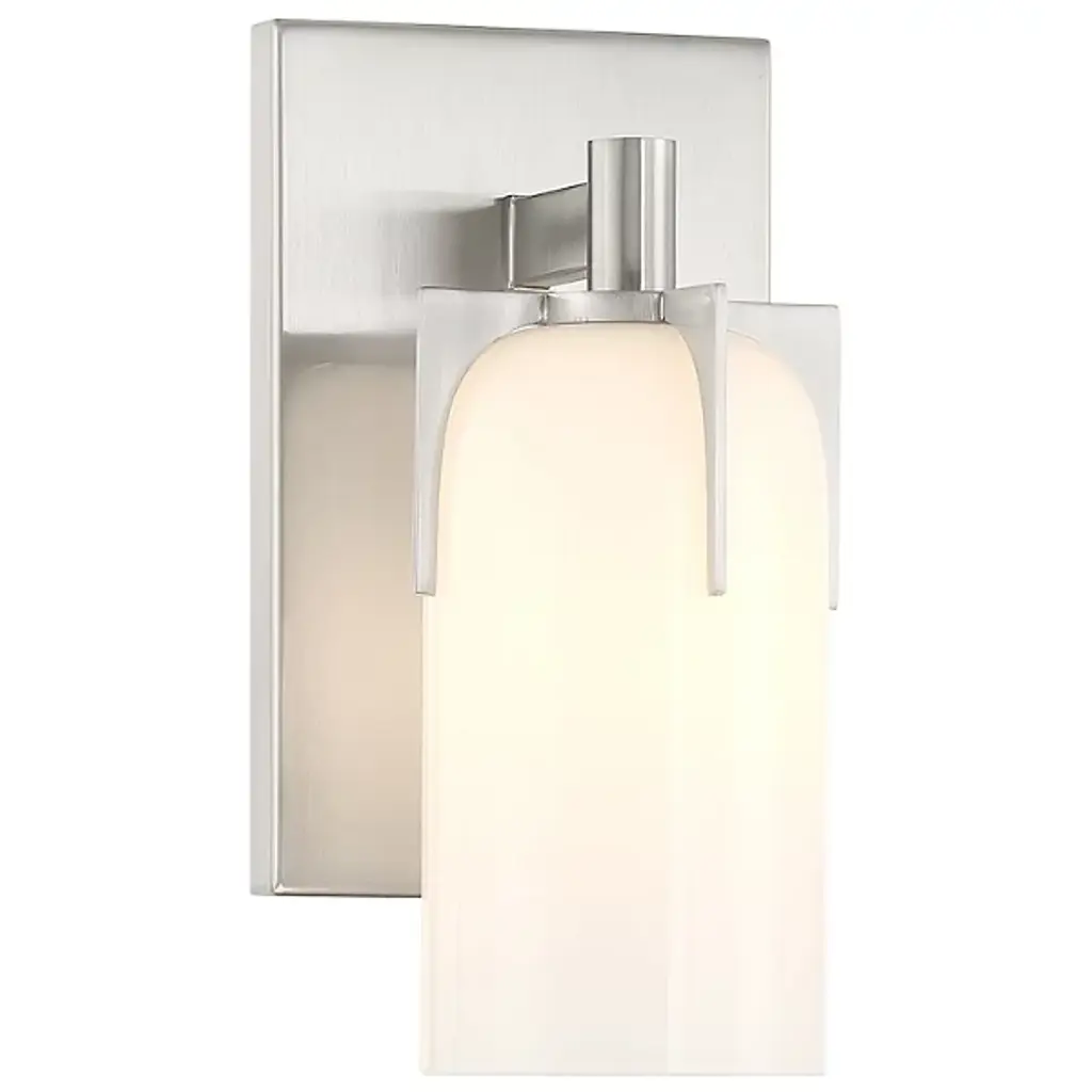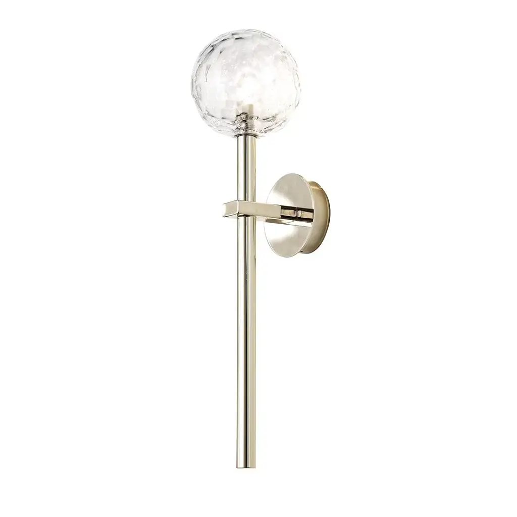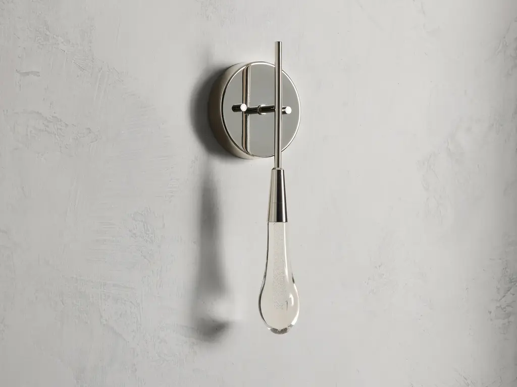 Featuring a sleek metal arm cascading into an integrated LED light handcrafted from seeded glass, our Soltaire Wall Sconce mimics the look of a fallen raindrop.