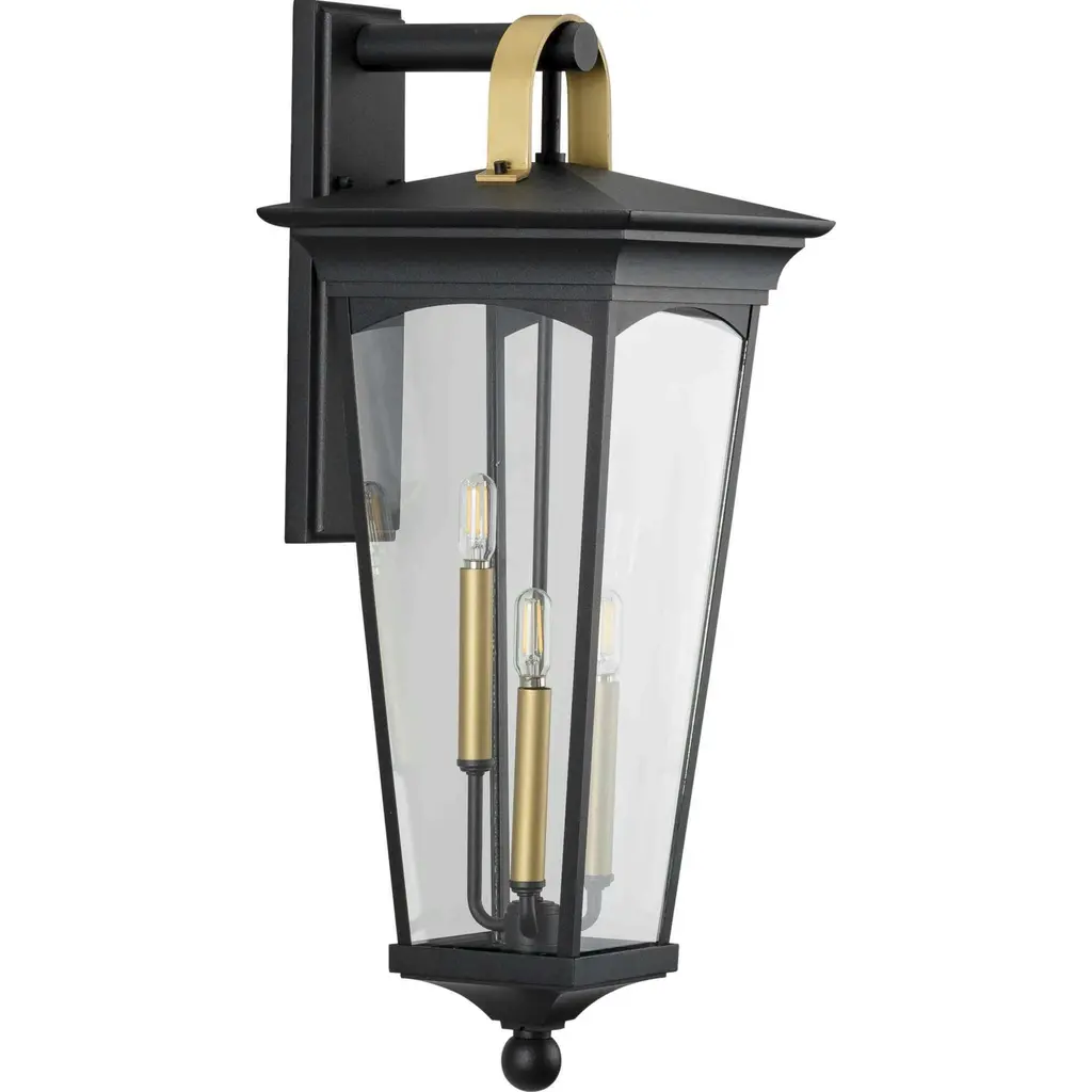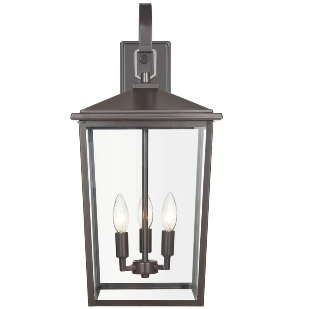 In a textured black finish, the Soren Indoor/Outdoor Wall Sconce borrows from traditional design to create a fixture that will last. With a classic lantern shape held by a subtle hook and a backplate, this piece displays a candelabra behind clear glass.