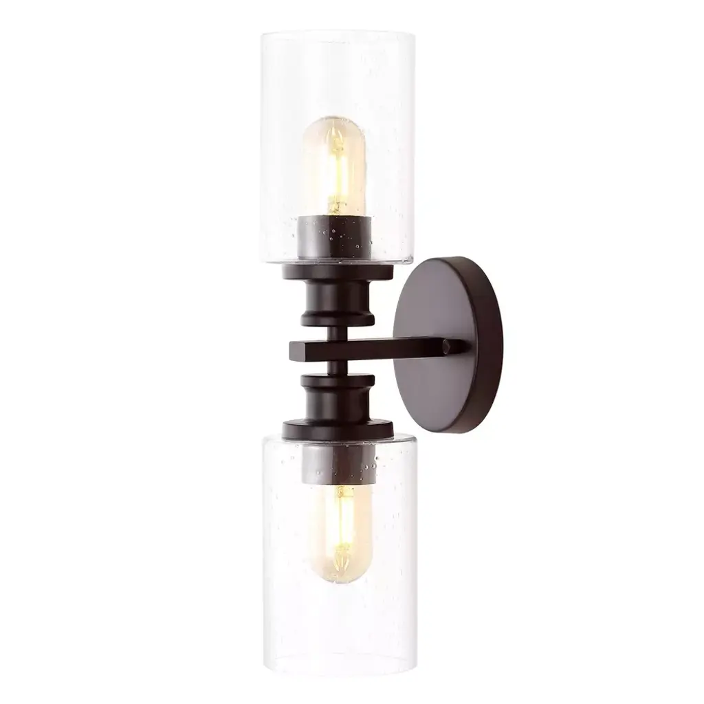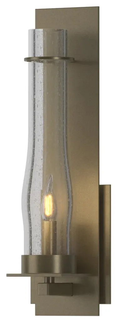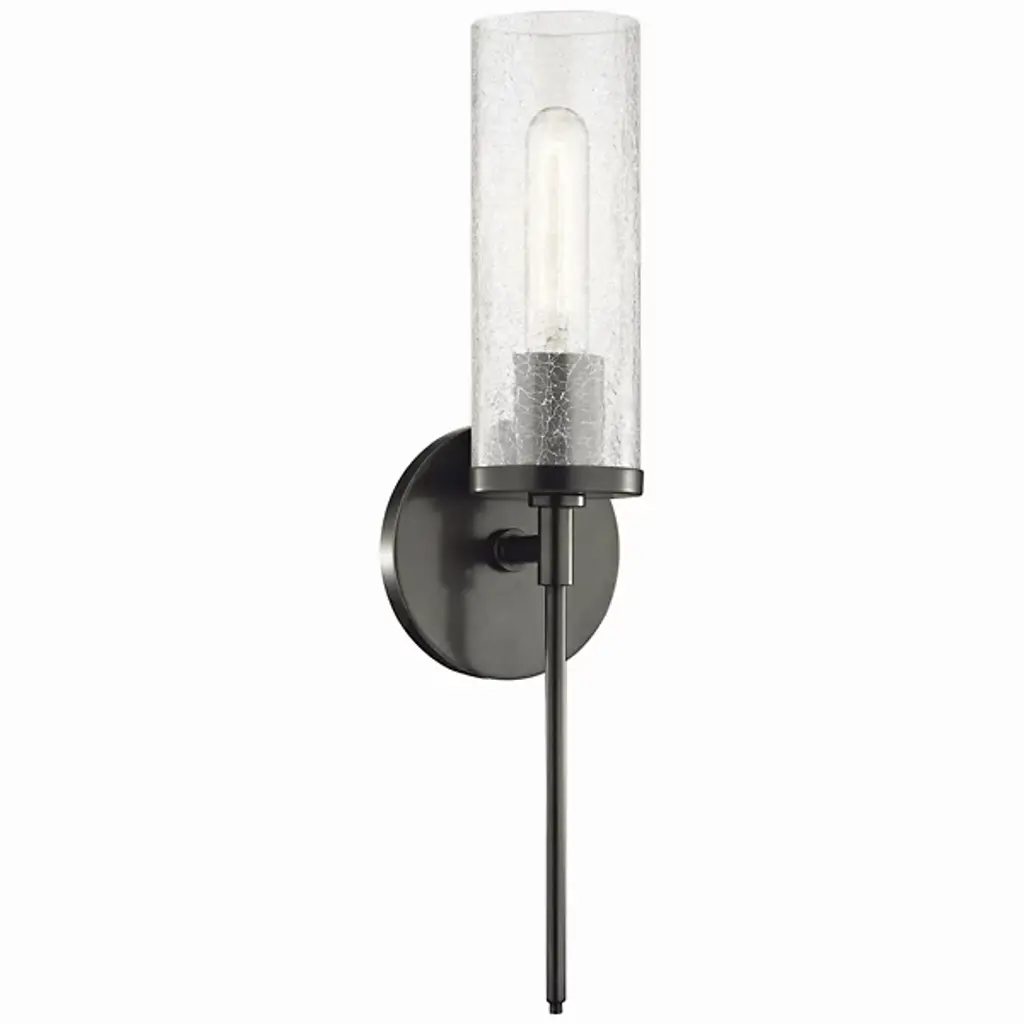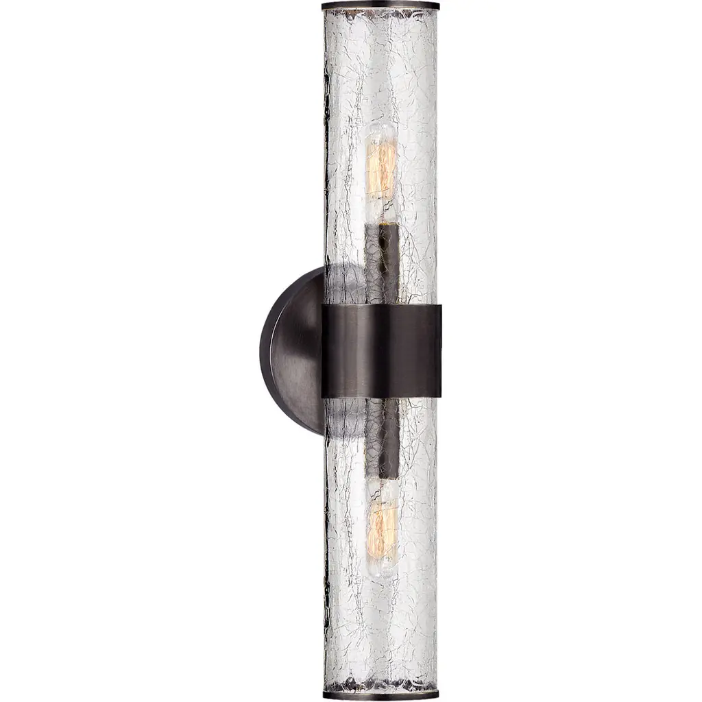 Like hurricane glass votive holders with a textural crackle touch, Soriano’s long diffusers icily obscure the bulbs’ warm glow. Aged Brass and Old Bronze contrast in the sconce version in what reads as the classic black-gold combination.