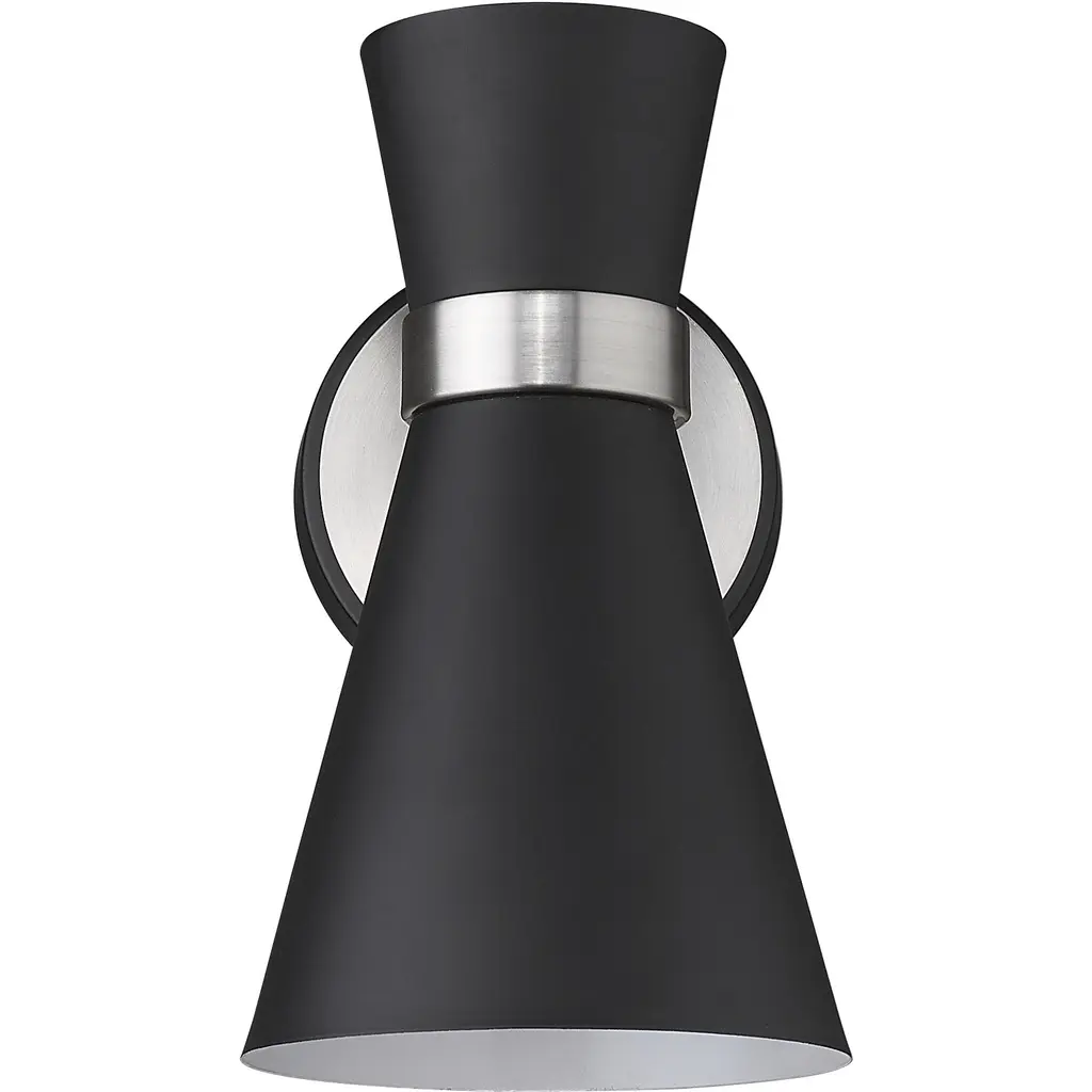A decorative silhouette shapes industrial influence that adds casual elegance to this matte black finish steel one-light wall sconce. Dress up a bathroom or hallway with this tasteful light trimmed with brushed nickel finish steel. This sconce works perfectly paired with an identical match in a side-by-side arrangement around a doorway or hallway entrance.
