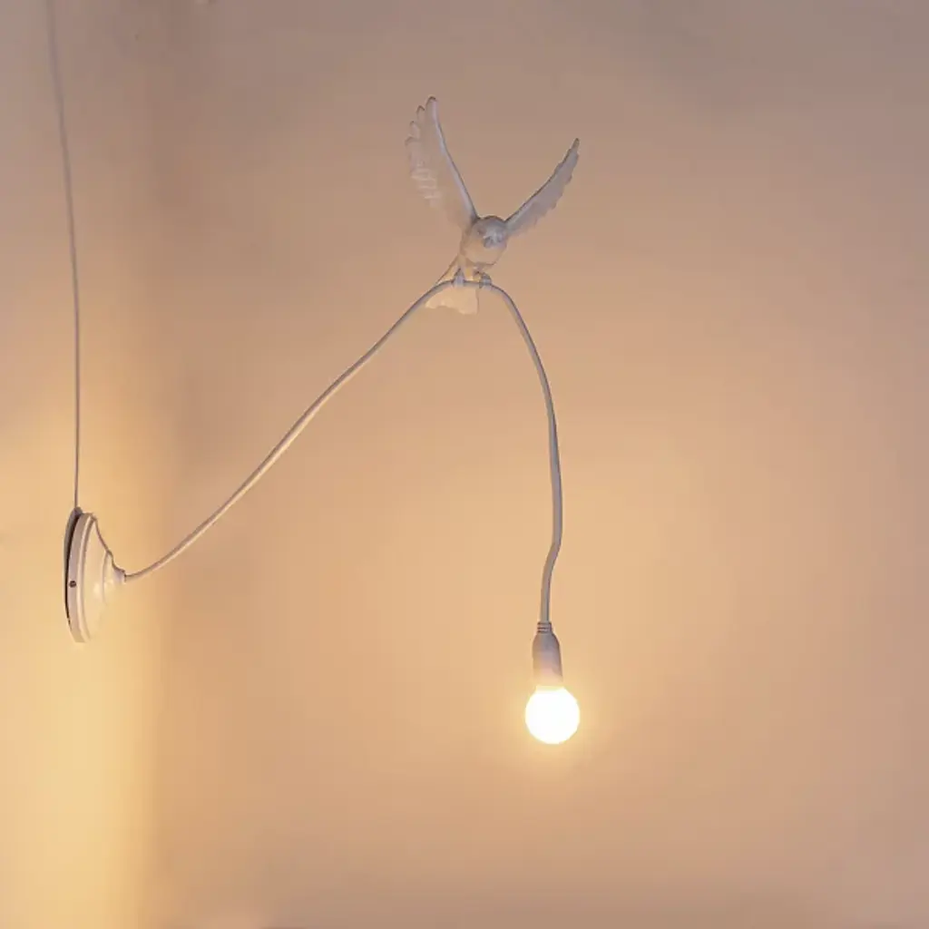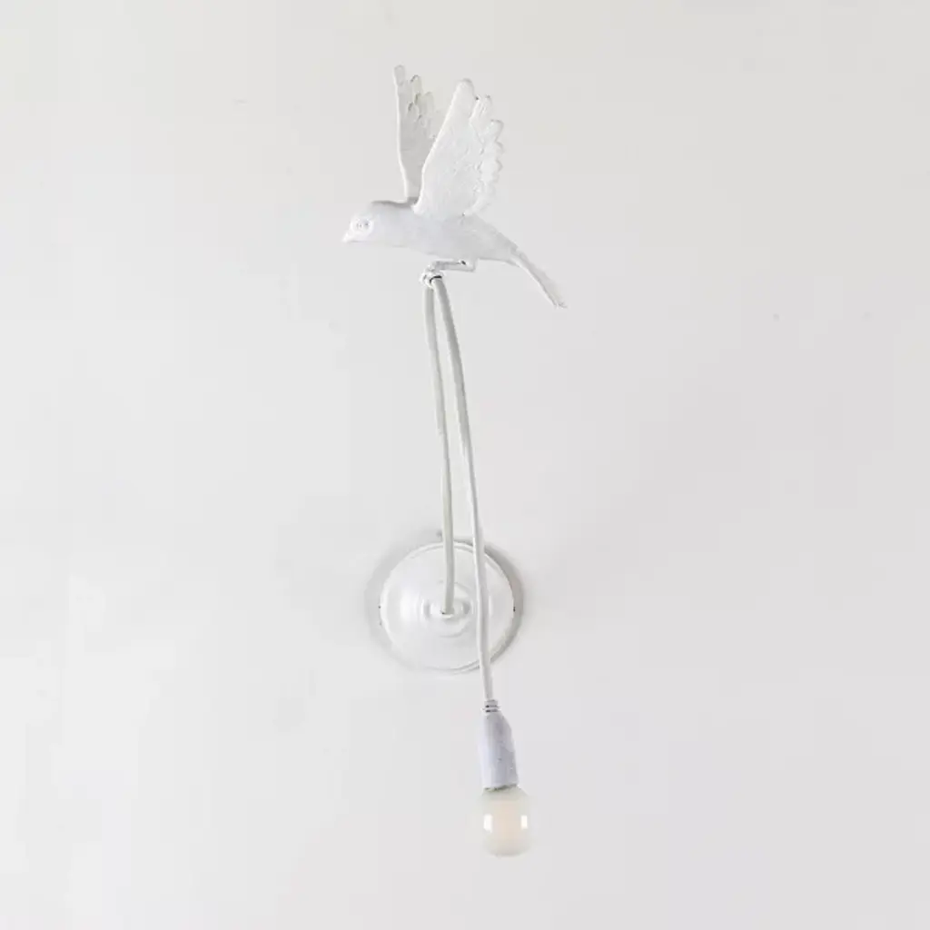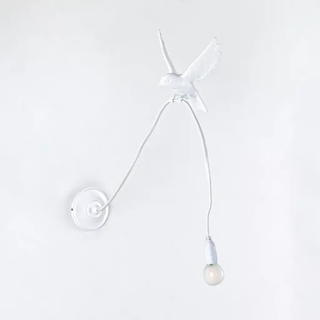 Enhance interior walls with the whimsical Sparrow Landing Wall Sconce from Seletti. Crafted by designer Marcantonio, this playful fixture draws inspiration from the lively movements of birds. Constructed from resin and steel, it features a disc wall plate with a cord extending from it, cleverly grasped by the legs of a sculpted sparrow. Mimicking the motion of a bird as it lands, this sconce brings a touch of nature's magic into any room. With its imaginative design and enchanting allure, the sconce adds a delightful ambiance, infusing your space with charm and whimsy.