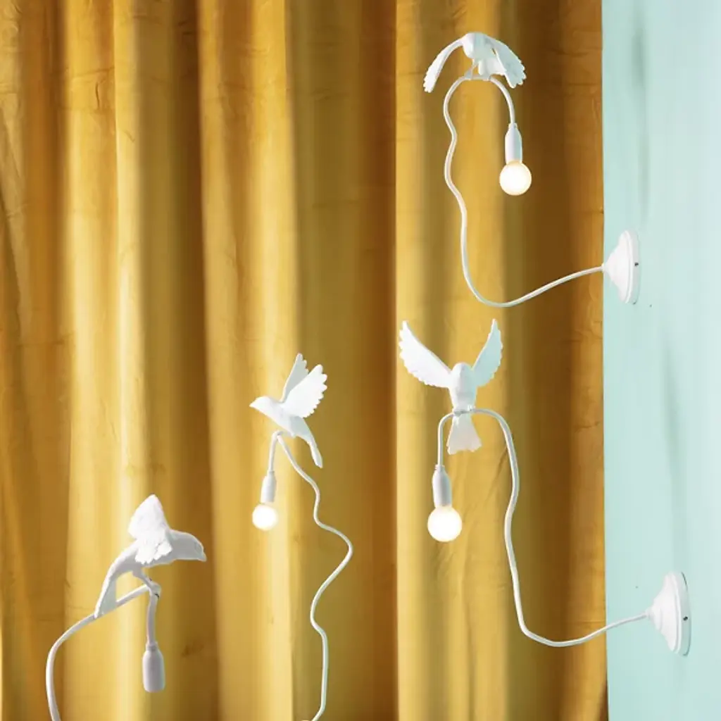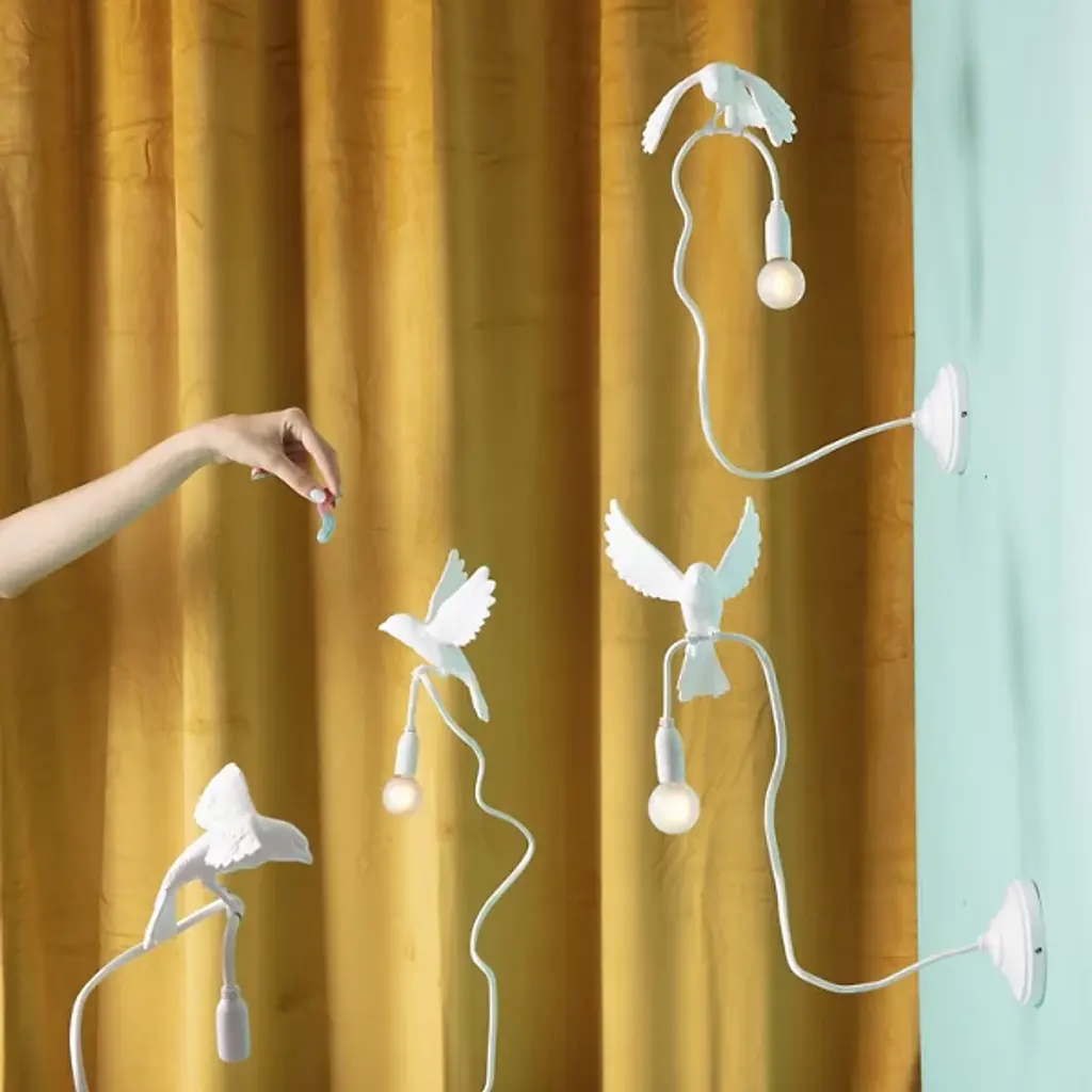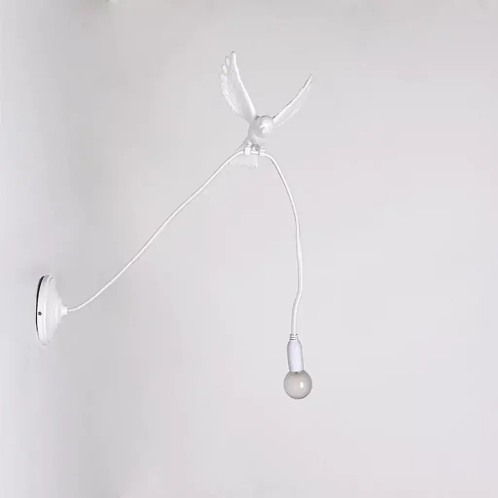 Enhance interior walls with the whimsical Sparrow Landing Wall Sconce from Seletti. Crafted by designer Marcantonio, this playful fixture draws inspiration from the lively movements of birds. Constructed from resin and steel, it features a disc wall plate with a cord extending from it, cleverly grasped by the legs of a sculpted sparrow. Mimicking the motion of a bird as it lands, this sconce brings a touch of nature's magic into any room. With its imaginative design and enchanting allure, the sconce adds a delightful ambiance, infusing your space with charm and whimsy.